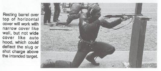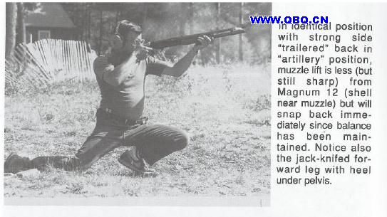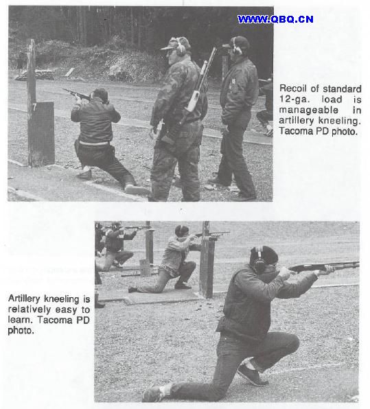 对于获得安定掩蔽位置的人来说,最有用的射击姿势是跪姿。注意,大多数人以为这就是普通的步枪跪姿姿势。他们忘记了霰弹枪的后坐力比普通的.308或者30-06步枪的后坐力都要大。如果你用普通的跪姿射击姿势来打霰弹枪的话(后脚的鞋跟垫在臀部下面,上身竖直),霰弹枪的后坐力会让你在两枪之内仰倒在地上。如果你象打普通步枪一样把前面的托枪手放在前膝盖上,你还很有可能出现上膛故障——前手的动作受到膝盖的限制太大了。