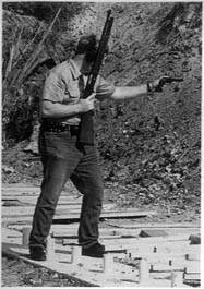 左撇子Brian Felter是《警用霰弹枪和卡宾枪》的作者,在这里Brain右手(弱手)持被雷打1200,左手持被雷打92,随时可改变为丢掉霰弹枪的双手持手枪姿势。
