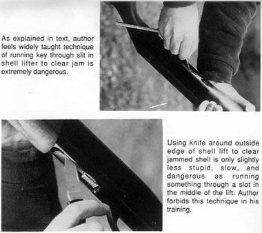 这个理论被发现是胡扯是发生在LFI 1983年的“高级战斗霰弹枪”的视频录制的时候,他们按上面说的动作做了,然后又赶紧修正了一下位置。为啥?他们说,用刀刃从这个角度戳进去,可以顶到弹壳的边缘。