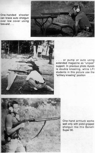 在使用霰弹枪的时候,射手的肘部应该保持指向地面的状态,以更好地利用骨骼肌的杠杆作用来紧紧地稳固住霰弹枪,控制后坐力和保持稳定的瞄准。抵住枪托的肩膀必须要位于对侧(与同侧对应)腿的前面,并且要承受上身的重量。如果没有抵紧肩来承受发射时的后坐力,枪托底部将会在腋窝上留下猛烈撞击的淤痕。再次强调,拥有战术枪托的好处就是可以借助手腕的力量有力地在发射时控制住霰弹枪。为了防止初级射手因为后坐力而发生意外性的二次发射,所以作者强烈建议在实弹训练时,按照发射一发上膛一发的原则来保证安全。