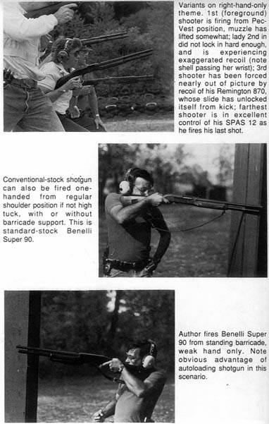 在单手射击的训练中,使用半自动霰弹枪会比传统的泵动式霰弹枪要好得多。肯定地说,受过良好训练的枪手在训练当中必须考虑到,在被扮演对方火力的同伴击中手臂的境况下,将手中的长枪放在一边而转换到随身携带的手枪是否具有现实的意义。