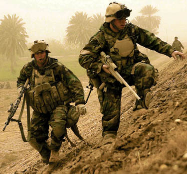 在伊拉克战争中的一个美国海军陆战队的狙击小组,主射手使用M40A1狙击步枪,观瞄手携带下挂M203榴弹发射器的M16A2突击步枪。