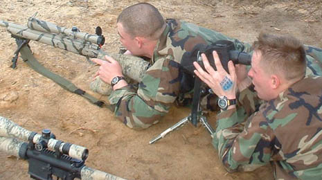专业的狙击手世界并不是由一个孤胆英雄,而是由一个训练有素的小组,美军从越战时期开始创造的两人小组形式现在已经被大多数国家的军队所学习,这两名狙击手各自担任不同的位置——一名狙击手(主射手)和一名观瞄手。狙击手负责对目标的瞄准和射击,而观瞄手则负责观察和警卫。