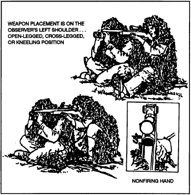 观瞄手的位置位于狙击手的后方并尽量贴近狙击步枪的枪膛轴线。如果狙击手是右手射击,观瞄准手的位置在他的右后方。