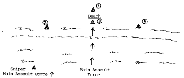 在海豹狙击手的教程中提到狙击手经常要担负尖兵/渗透侦察分队的作用,因此一个狙击小组可能多达4人,而且在此类任务中的武器多以自动武器为主。下图就是海豹狙击手教程上的关于狙击小组在抢滩时运用的例子:狙击小组必须比主力部队提前到达目标海滩,为主力部队标记准确的登陆地点,并为主力部队提供正面180°的安全警戒。可能的话最好部署两个狙击小组。