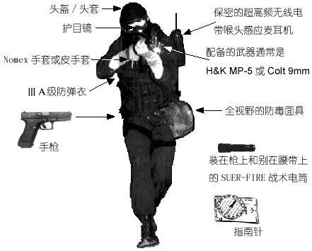上述的装备只是大多数情况下的配备,SWAT队员会根据需要自行增减其装备。最普遍的配备通常是:一支配有激光瞄具和战术灯的消声冲锋枪通常会是标准的突入武器;手枪在大多数战术分队中只作为后备武器,通常是.40或.45口径(有些战术分队会采用9mm口径)。