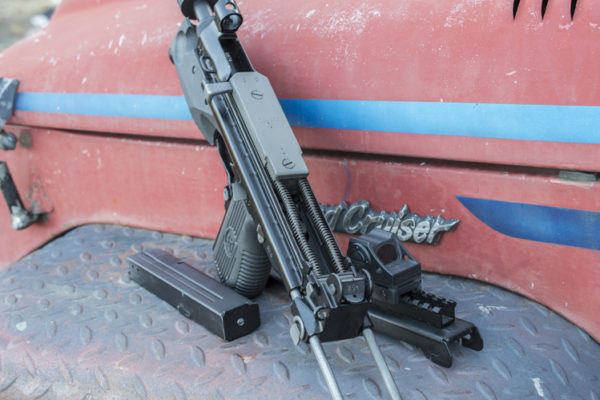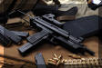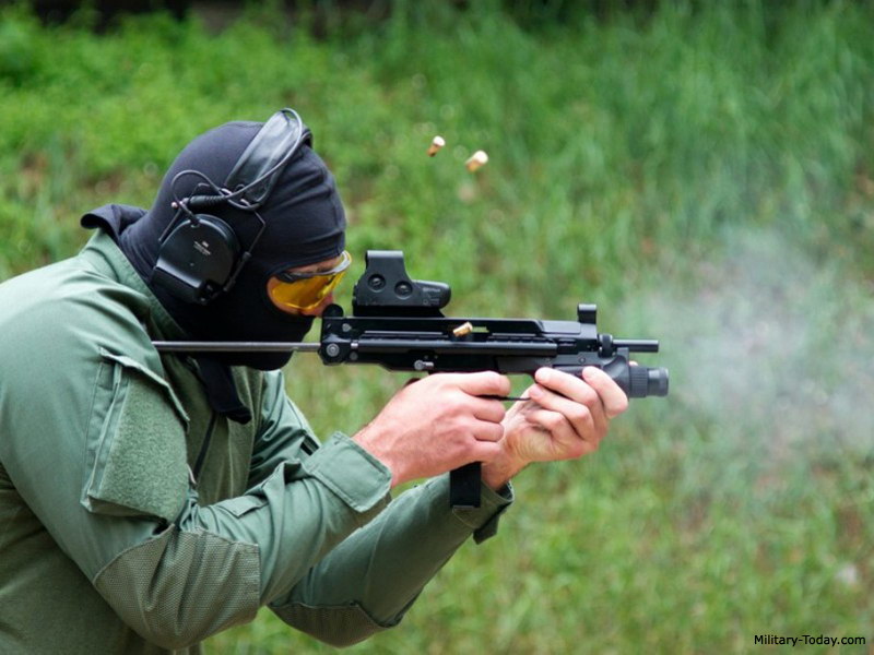 然后,PM-06的拉机柄把向上翘改为向下弯的L形,因为如果在机匣顶的导轨上安装了一些体积较大的瞄准镜后,向上翘起的拉机柄即使用左手操作也容易被瞄准镜妨碍,所以干脆把拉机柄改成略向下弯。如果需要左手握枪、右手待击时,把这个小巧的枪身横过来就可以了。