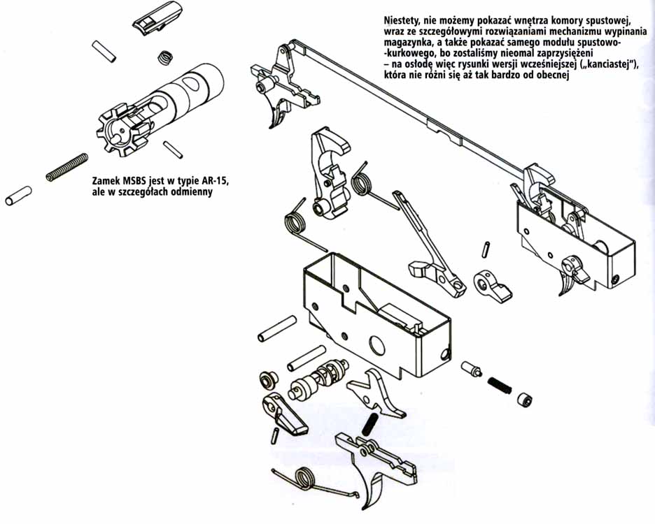 MSBS系统的模块核心是一个倒置的U形机匣,由铝合金制成,枪机组、复进簧、枪管和导气系统都安装在这个机匣上,通过装上不同的扳机组、枪托、护木等部件来实现不同版本的组装。从结构图来判断,2010年以后的MSBS系统似乎参考了MagPul Masada步枪不少地方,这可能与当时的波兰特种部队购买和试用过一小批雷明顿ACR有关。