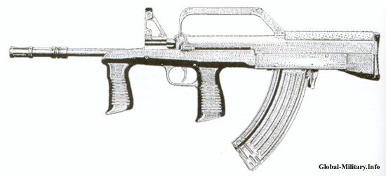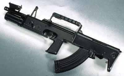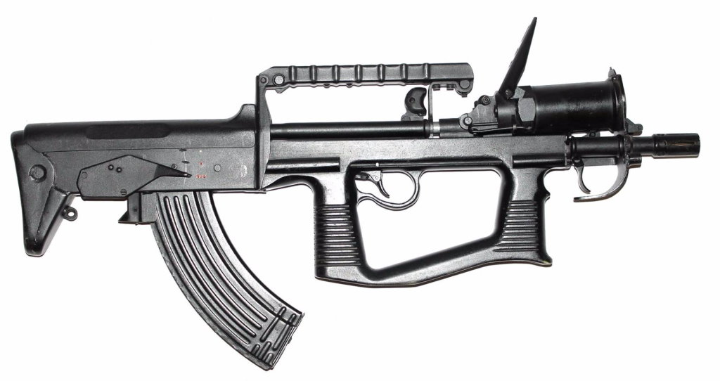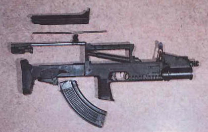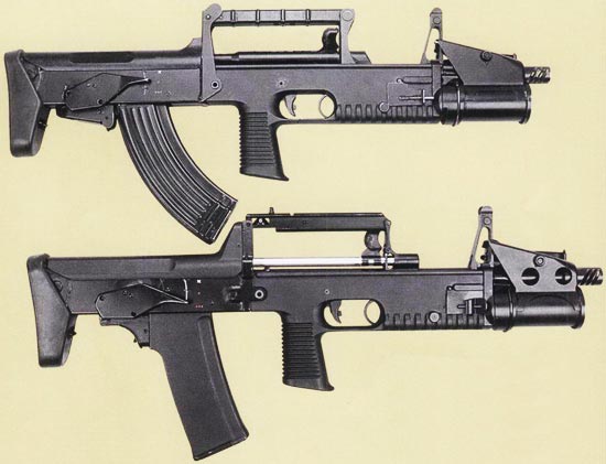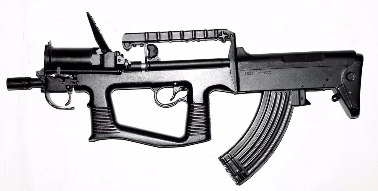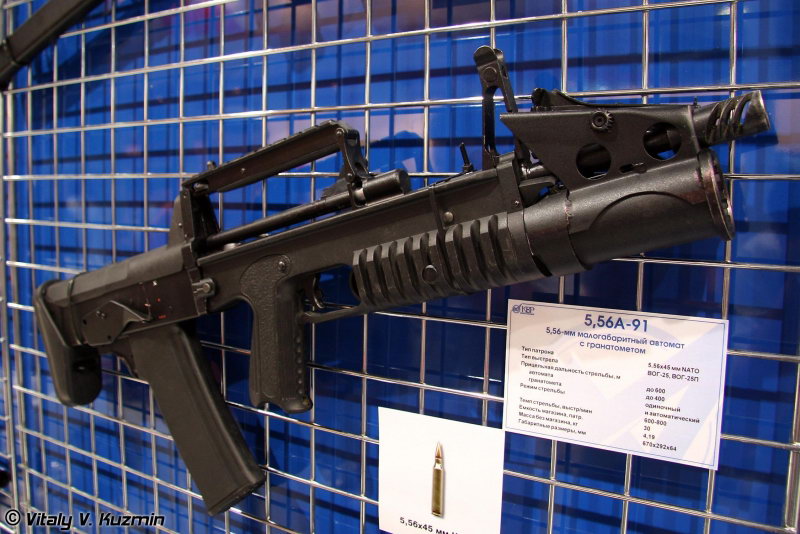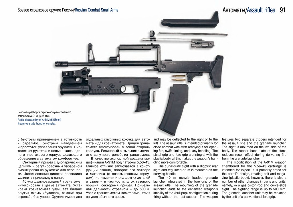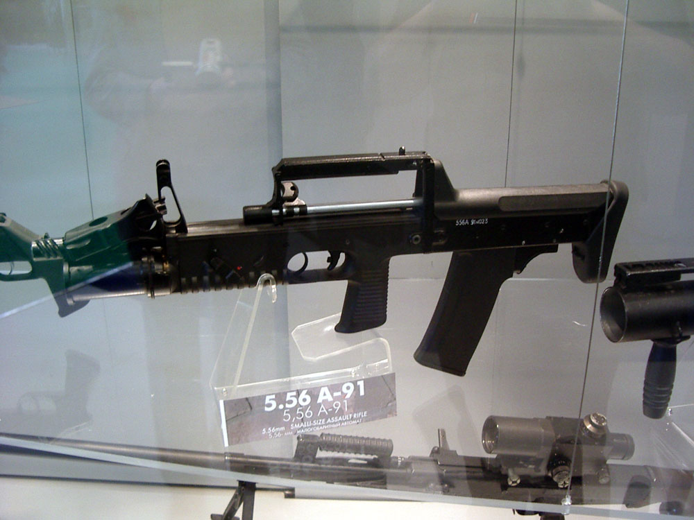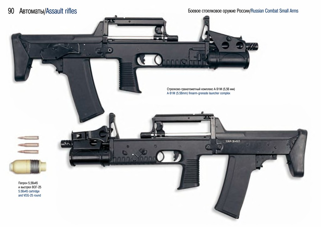 A-91突击步枪(后期型称为A-91M)是由KBP设计局在1990年代期间研制的,是9A-91的一个无托结构化后代,但不属于A-91紧凑型突击步枪的枪族。虽然A-91保留了9A-91基本的导气系统、枪机和击发机构,但整体结构改为无托式的聚合物枪身,并在枪管下方整合了一个40mm榴弹发射器。A-91在1990年代中期的原型是把榴弹发射器整合在枪管上方的,并有一个带榴弹发射器控制扳机的垂直形前握把。而2000年代初期的A-91则把榴弹发射器改在枪管下方,并兼作前护木。