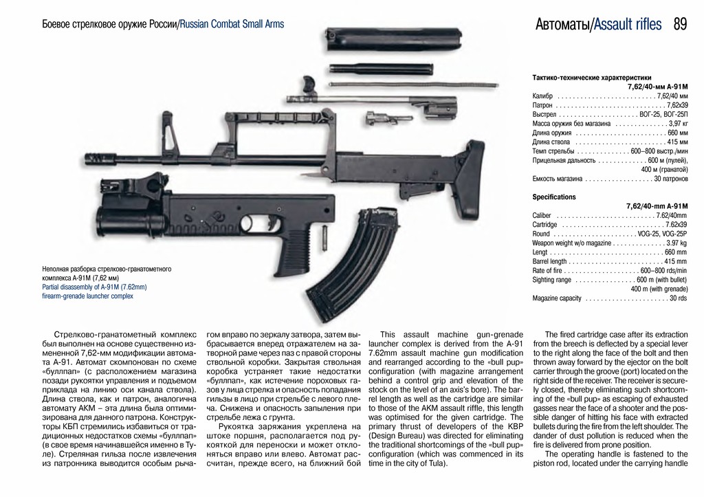 A-91最特别的地方是采用了向前抛壳的系统,类似于FN F2000的作用,俄罗斯方面的资料指,早在1960年代的前苏联时间,图拉的设计师就已经开始研制这种抛壳系统。在当时的设计师注意到虽然无托结构的可以在保证枪管长度的前提下缩短全枪长度,但却带来了其中几个固有缺点,其中有两个都与抛壳口接近贴腮位置有关:一是可以左右手射击的问题,当左手射击时弹壳会打到面上;二是从抛壳口逸出的火药燃气会熏到眼睛,干扰瞄准射击。A-91的抛壳系统与F2000类似,空弹壳被枪机头向前推,通过枪管右上方一段专门的抛壳管送到拉机柄附近抛壳口,向前推出枪外。 1990年代中期设计的A-91早期型的榴弹发射器扳机在前握把的前方,而2000年后的型号因为榴弹发射器移到枪管下方,占据了原本前握把的位置,因此采用了双板机结构,在放大的扳机护圈内,后面的扳机是控制步枪的,前面的半月形扳机则控制榴弹发射器。 在机匣右侧和弹匣座上方有一个大形的快慢机/保险杆。在步枪的板机内还另外配有一个自动板机保险装置(有点类似于Glock手枪)。拉机柄在机匣上方,在提把下面,左右手均可操作。 瞄准装置是柱形准星和安装在提把上的觇孔式照门,射程可调。提把顶端有一个导轨,可安装多种瞄准装置。折叠式榴弹发射器瞄准具装在枪管前方(原型是安装在榴弹发射器上)。 在最初开发时只有7.62×39mm口径,并使用标准的AK弹匣。在2003年KBP开始推出新的5.56×45mm口径的型号,并采用专用的30发塑料弹匣。后来又推出了5.45mm口径。根据不同的口径,分别称为5.45-A91M和7.62-A91M或5.56-A91M。而前装式的整体榴弹发射器发射VOG-25系列40mm榴弹。 目前,三种口径型的A-91都已经少量生产,并可能已经被俄国一些执法机构的特种部队采用,也出口到外国一些私人武装和警察单位。 到了2010年后期再改进的A-91步枪在外观上与ADS两用步枪极为相似,难以分辨。 |