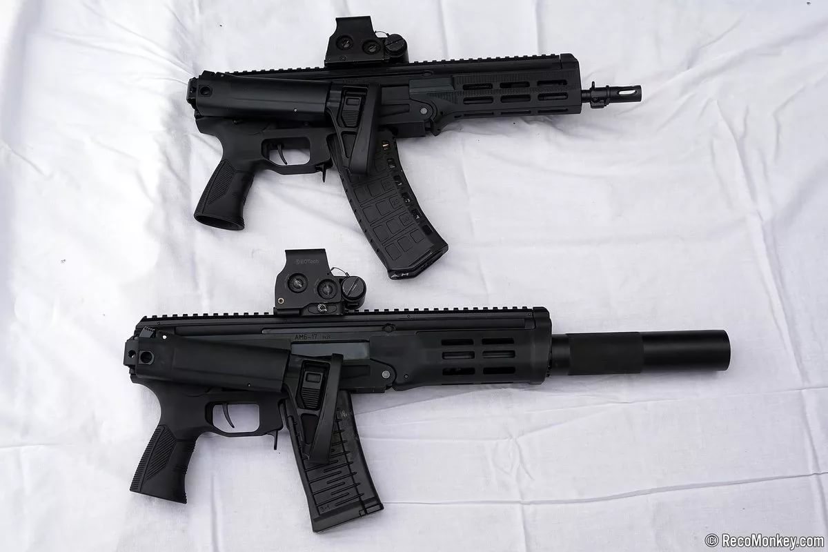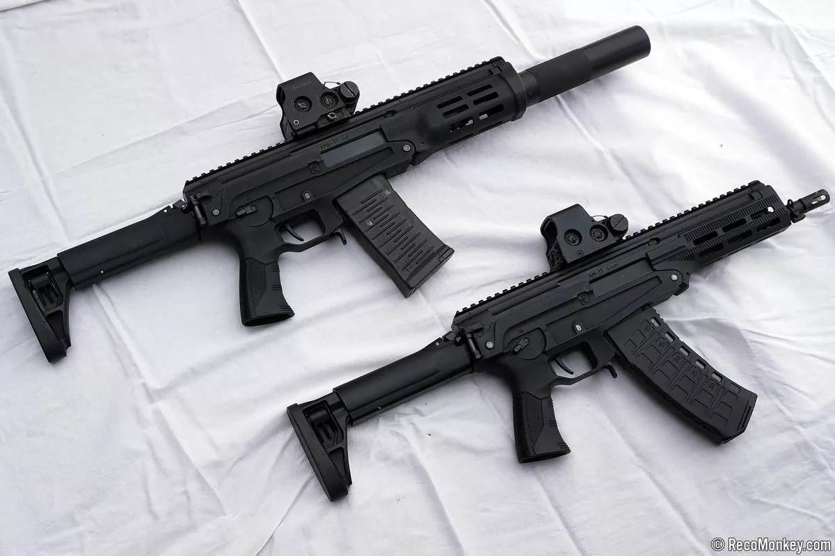 新的MA短突击步枪在2017年的陆军论坛上也展出过,但到了“陆军2018”论坛上,卡拉什尼科夫集团公司却MA短突击步枪的进一步改进型,并重新命名为AM-17。AM其实是Автоматы малого的缩写,翻译过来仍然代表“微型突击步枪”的意思。新的AM-17除了5.45mm外,还增加了9x39mm口径型,并安装了消声器,这个型号被称为AMB-17( АМБ 17,“Б”表示消声器)。该枪似乎估在改进,可能仍然处于原型阶段,每一次公开最新的样枪都能看到一些细节上的变化。