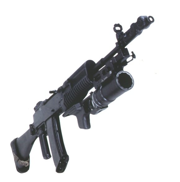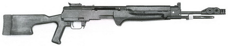 这是第一支不采用后退弹匣和可以进行2发点射的样枪。它采用坚硬的胶合板枪托和塑料护木。托底板由铝合金制作,小握把由热塑性塑料做成。该枪最显眼的部件是消焰器,它由3部分组成:独特的可调消焰器本身、整体式准星和2个小室。消焰器各侧都有3个垂直的孔。活动部件是枪管的组成部分,有2个附带的前支撑。护木后方的塑料罩内安装有抑制后坐的弹簧缓冲器。