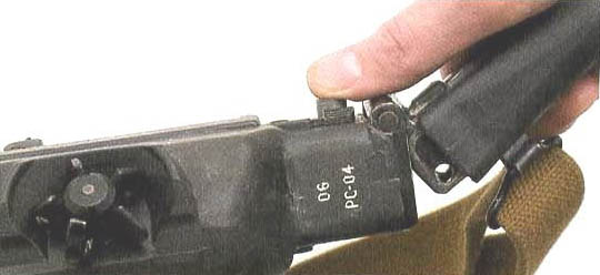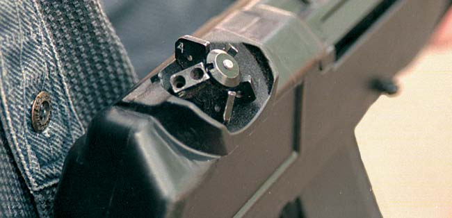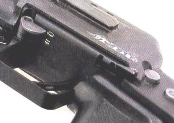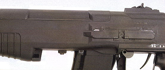 保险和快慢机是分开的。保险在扳机护圈里面,而快慢机在机匣的左侧,是在扳机护圈上面的一个小开关。快慢机有3个位置,为单发、2发点射和为全自动。保险有2个位置 - 保险和射击。枪托是用与枪壳相同的高强度塑料做成,而且可向右折叠以减少长度。