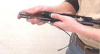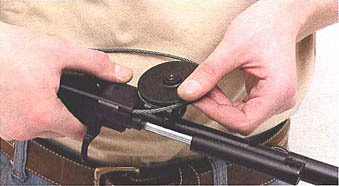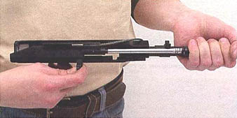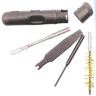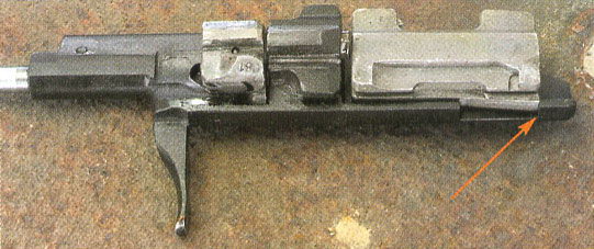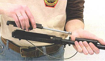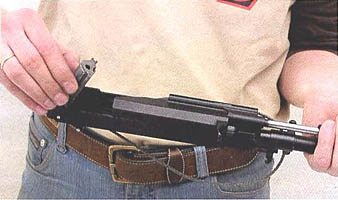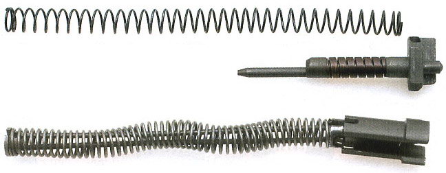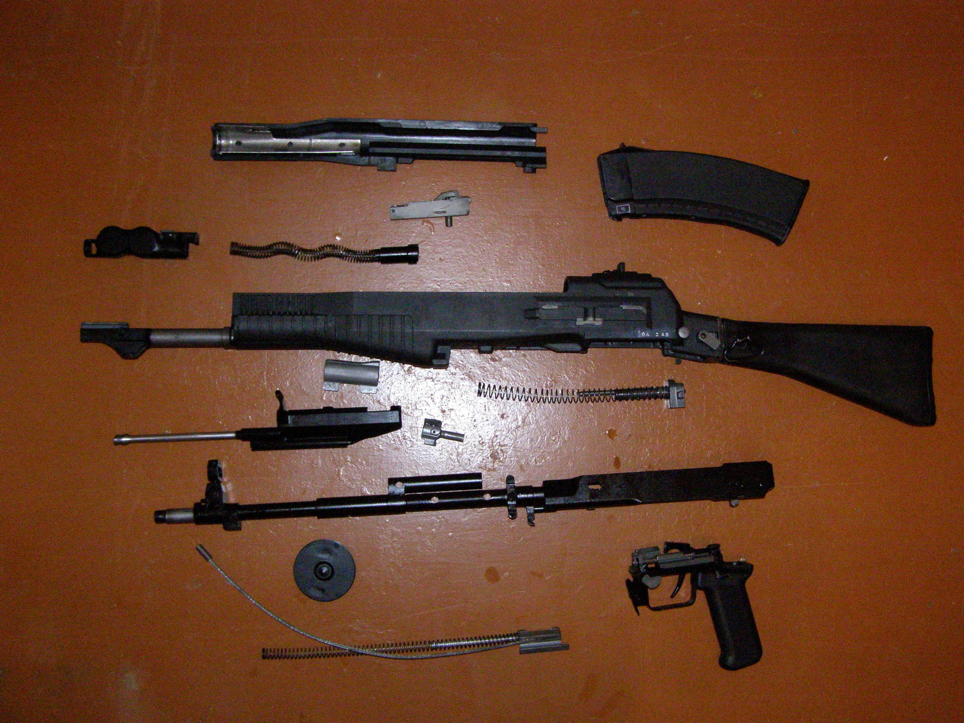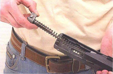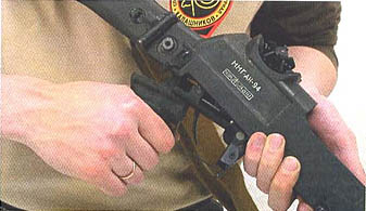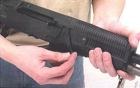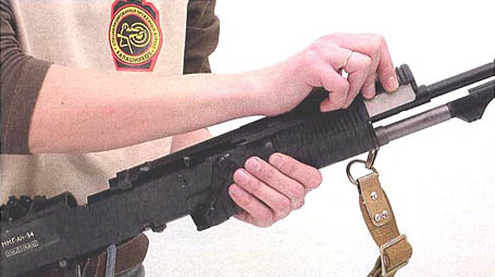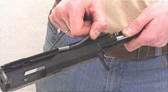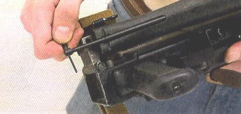 机匣盖与护木是一个部件,要将其松开和取下,必须将机匣前右侧的解脱杆向下转动。然后,将自动机组件和枪管从其在机匣里的滑动支座和延长杆上拉出。击发组件也可以从枪上卸下,分解时必须将机匣锁定钮按压到底,牢牢抓住,然后旋转位于小握把上方的小解脱杆,使击发组件松开。