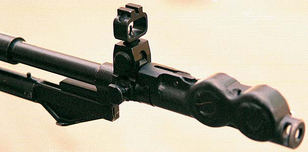 外形看似“8”字形的枪口制退器内有2个空腔,是带有自我清洁作用的枪口制退器,被宣称是高效的。需要时能很容易地从枪口拆出。准星座的右边有一个后刺刀座,因此刺刀是水平安置的,在枪口右侧。据宣称这样能使刺刀在格斗时有更大的刺杀力,但真正的原因可能只是这允许在安装刺刀的同时能发射榴弹发射器,这在AK步枪上是不可能的。另外据说刺刀在这个位置还可以用来从侧面剪东西。