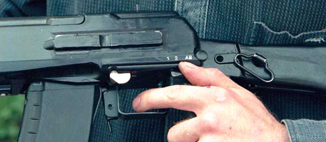如果快慢机装定在“两发点射”模式,此时,击锤将会保持待击直到板机先松开再次扣压才被释放。如果装定在“全自动模式”,只要仍在扣压扳机,击锤组将会自动转变成连续的击发动作,直到松开扳机或打光弹匣内的枪弹才停止。