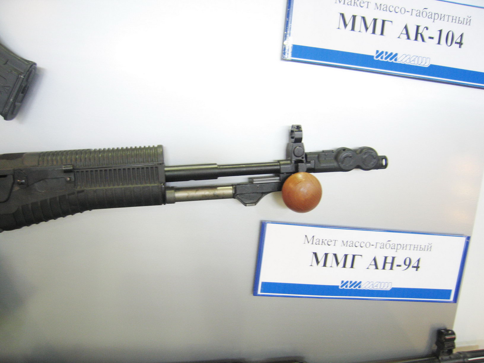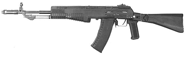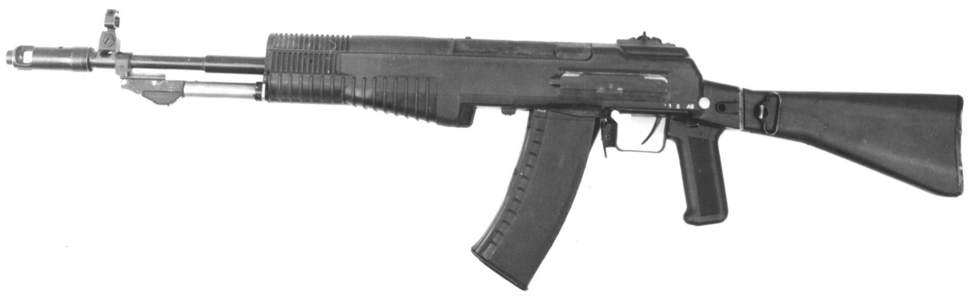 这是最后一支采用后退式弹匣和3发点射机构的样枪。这支枪与最终型AN-94已经接近。在枪管下方有个延长杆。通过枪口消焰器控制沿着延长杆运动的滚轮,帮助枪管和自动机运动,减小后坐力。作为护木的前托由聚酰胺做成,其上沿有个垂直的突起,防止射手的手在射击过程中被弹匣一起带着后退。在护木下方有既可充当向后折叠的武器支撑,又可保护弹匣的装置。只有这一装置打开的时候,才能插入30发标准盒式弹匣。由于采用这一机构,使弹匣以及射手的手都不会碰到受弹口壁或抛壳口。该枪也是采用胶合板制作的折叠枪托,折叠方向朝右,快慢机正好在弹匣后部的弹膛部位。