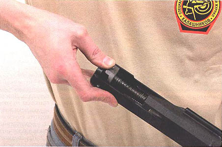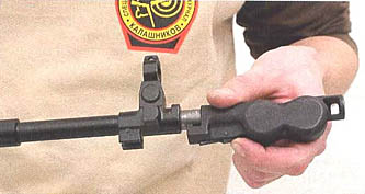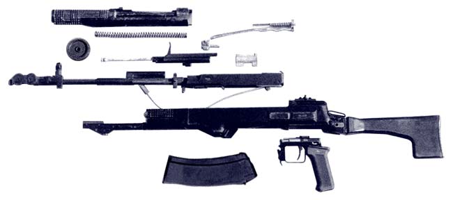 枪管沿着枪托延长部分的导轨后退。这种解决方式已经和最后定型的AN-94相当。在枪托的右侧有可卸式击发机构解脱杆。机匣后方的小握把上方的按钮作为这一解脱杆的支座。