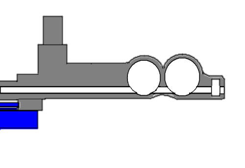 在搞清楚了机匣组和供弹板的运动方向和枪弹装填的路线后,现在我们再来看看动作过程的图片。如图中所示。首先,当把一个装满的弹匣插入空枪中,枪管/机匣组是在前面的位置。当拉动机柄,机框后退,开启并带动枪机一起后退。同时,钢索拉动撞锤向前运动,把弹匣上的第一发弹推进机匣中的供弹板上(在这过程中的另外一个同时动作是击锤待击,击锤也是安装在活动的机匣中)。当释放拉机柄后,枪机组会复进,把放置在供弹板上的枪弹推进弹膛,并与枪管闭锁。现在,枪准备好发射了。