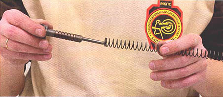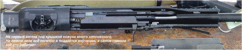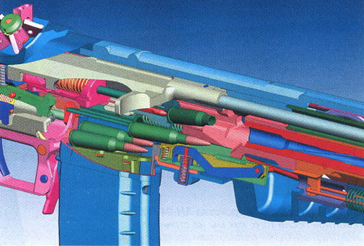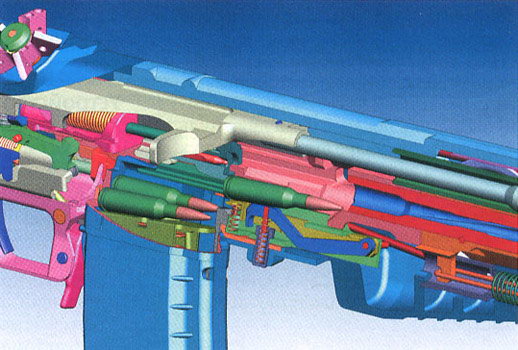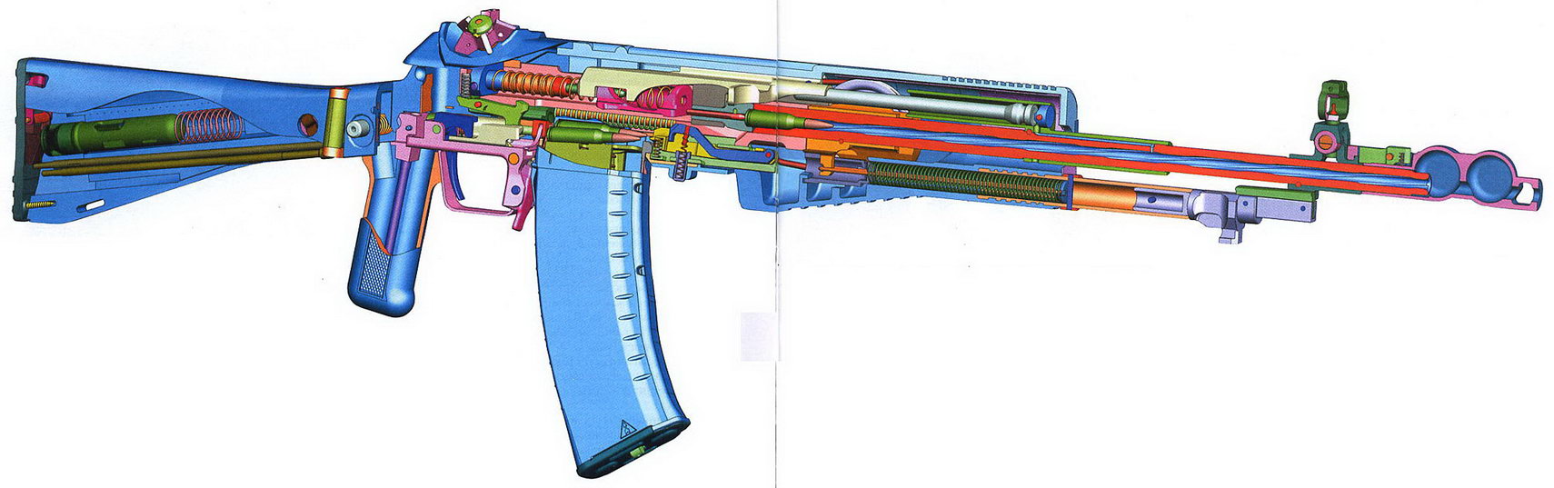 我们先来重温一下AN-94的基本结构:AN-94的自动机构由双闭锁突笋的回转式枪机和长行程导气活塞组成(这一部分完全是由卡拉什尼科夫的设计改进而来的)。枪管和导气室安装在机匣上面,枪管后面连着一个供弹板,它们连同机匣在玻璃纤维增强的聚合物枪壳和有整体式护木里面后坐,机匣有其独立的复进簧,该复进簧位于机匣下面,在枪壳的底部左侧。在枪管下面的导杆前安装有一个滑轮,有一根钢索绕过这个滑轮,一端连在枪机组的机框,另一端则连着一个供弹用的撞锤(是一个不会敲击底火的滑块)。