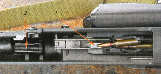 枪弹并非直接从弹匣内推进弹膛内,而是由两个阶段组成:先从静止的弹匣中推到正在后坐的机匣内,这个过程是由两个动作同时实现——像铲子一样的供弹板在后退的同时,撞锤把弹匣上的最上一发弹推到供弹板上;然后复进的枪机再把枪弹推进弹膛内。特别的是,AN-94的弹匣是向右侧倾斜约15度,就是为了让开钢索和点射中第2发弹的预装填位置及机匣复进簧的位置。