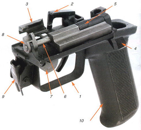 ![]() 1-扳机护圈;2-扳机;3-扳机连杆;4-快慢机;5-连杆簧;6-连杆轴;7-保险手柄;8-保险杆轴;9-弹匣卡笋;10-握把 |