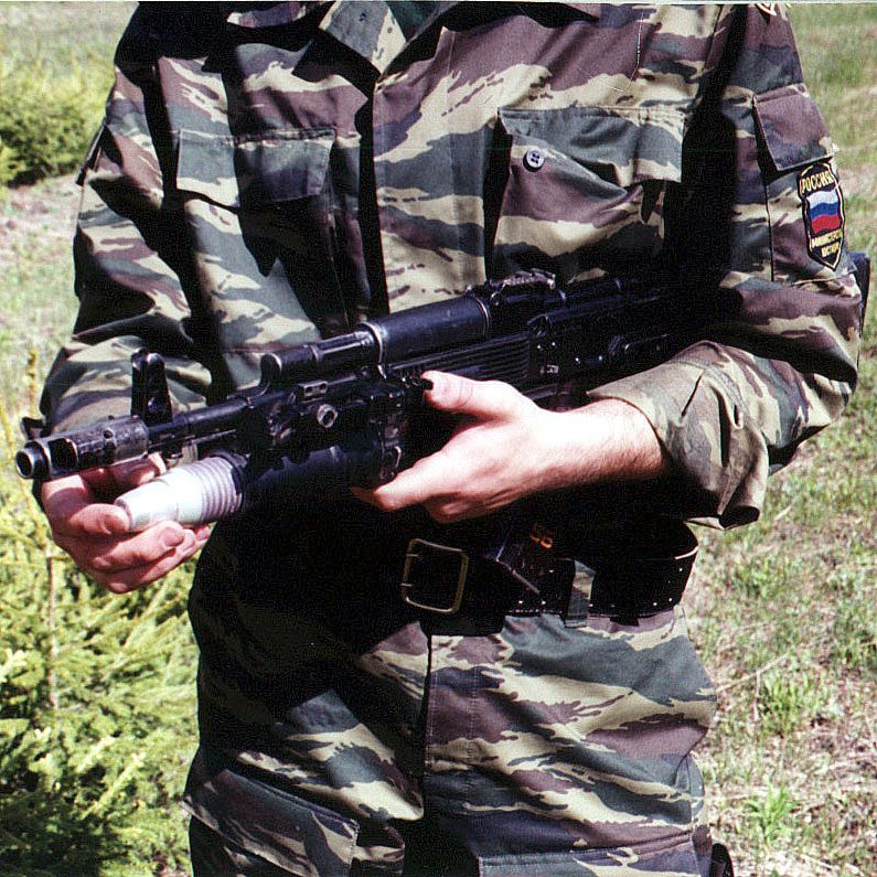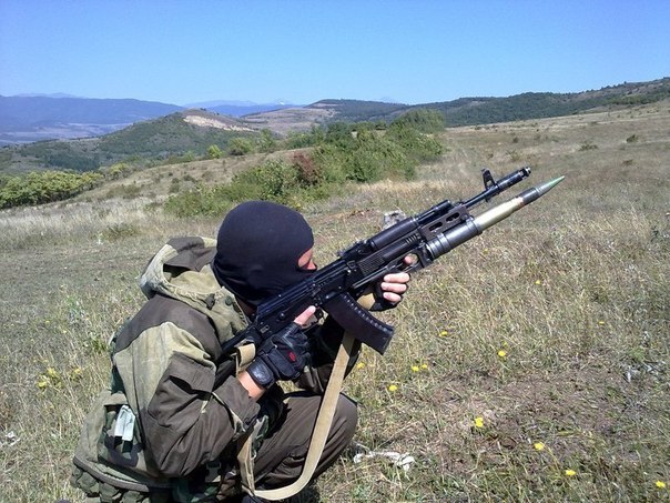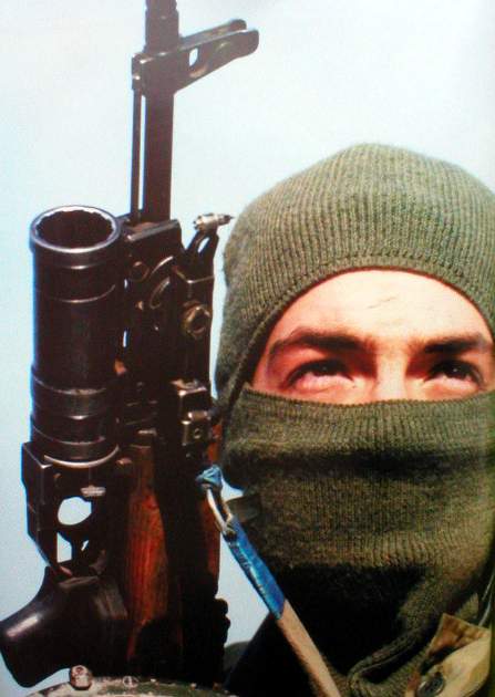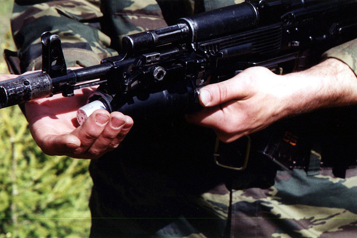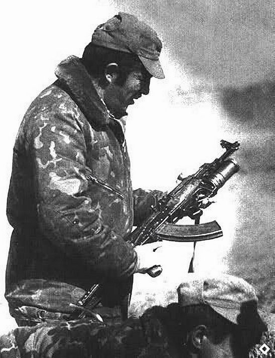 阿富汗战争中的苏军士兵,从枪口安装的PBS-1消声器与枪托细节判断,图中这把安装GP25的步枪可能是安装40发弹匣的AKM而非安装45发弹匣的AK74