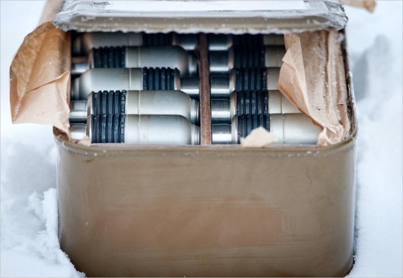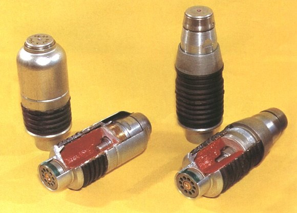 药室用铝合金压铸成形,用螺纹旋接在弹体尾部,药室内有一个铝质药盂,发射药装在这个药盂内,平时起密封防潮的作用,发射时起初始闭气的作用。药室口部旋入一个底火座来封闭,底火座上有10个泄气孔,发射时火药燃气从泄气孔进入低压室。弹体内衬有一个硬质环形纸板,纸环上有纵横交错的孔,纸环内装48g的钝化黑索金炸药,爆炸后弹壳可形成大约180片杀伤破片。引信为全保险型触发引信,有延时自毁机构,如果落在松软的物体上不能触发引信,在发射后14秒也会自行爆炸。