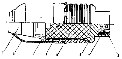 ①引信;②风帽;③弹体;④环形纸板;⑤炸药柱;⑥药室;⑦发射药;⑧杯状螺塞