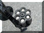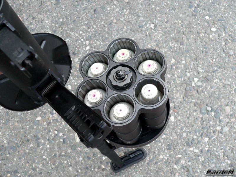 首先,MGL就和普通的转轮手枪一样,转轮里的只是容纳弹药的弹膛,在转轮前面的是带膛线的枪管,起定向和自转稳定的作用。而RG-6的前面的“枪管”是假的,只是一根比弹径略大的滑膛管,射出的弹头并不与假枪管的内壁接触。真正的枪管其实就是转轮内的弹膛本身,因此弹膛内有12条右旋膛线。事实上,RG-6的转轮根本就是把6根GP-30的枪管呈梅花状排列成弹巢形转轮。RG-6的假枪管的用处其实只是用于固定前握把、机械瞄具和弹巢前的圆形护盖。