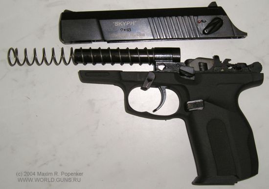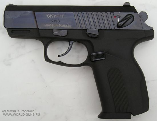 MP-448 Skyph手枪是马卡洛夫手枪的最新改进型,由伊热夫斯克机器厂(Izhevsk Mechanical Plant,简称IzhMech,或Baikal)在1990年代后期研制。该枪采用工程塑料制作底把,钢铸发射机座,改进了更可靠的保险机构。由于采用工程塑料因此Skyph手枪的重量比马格洛夫要轻,其外形设计也更符合人体工程学。这个型号主要用于出口,有两种口径,分别为9mm马格洛夫PM手枪弹,或9mm勃朗宁短弹。除标准的MP-448 Skyph型(МР-448 "Скиф")外,还有一种更小的MP-448S Mini Skyph型(МР-448С "Скиф-мини")。