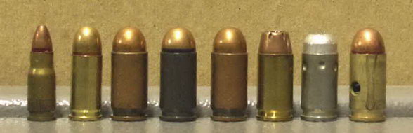 左边第1枚是5.45mm MPTs手枪弹,第2枚是匈牙利的7.65×17mm手枪弹,剩下的都是不同型号的9×18mm手枪弹