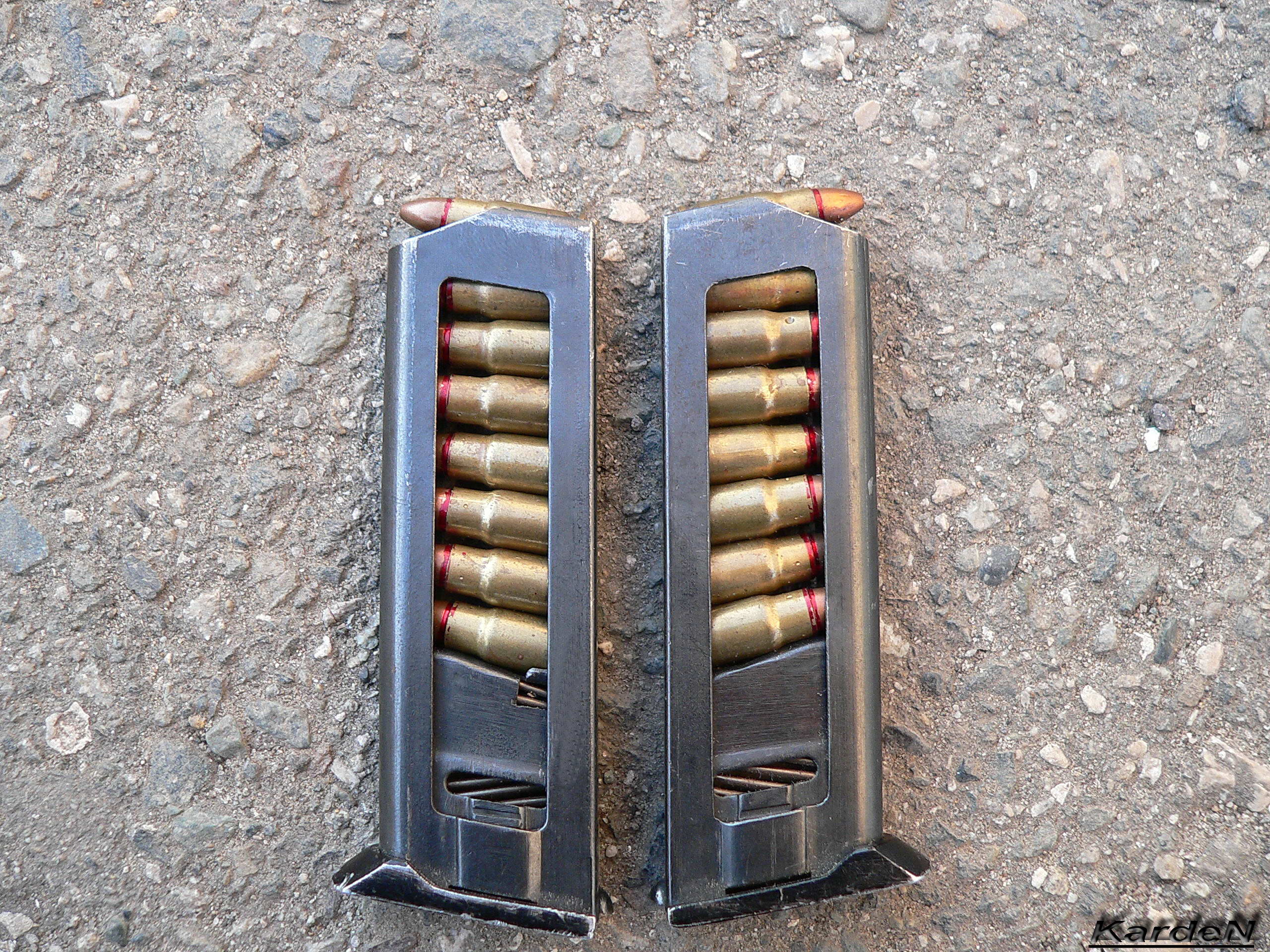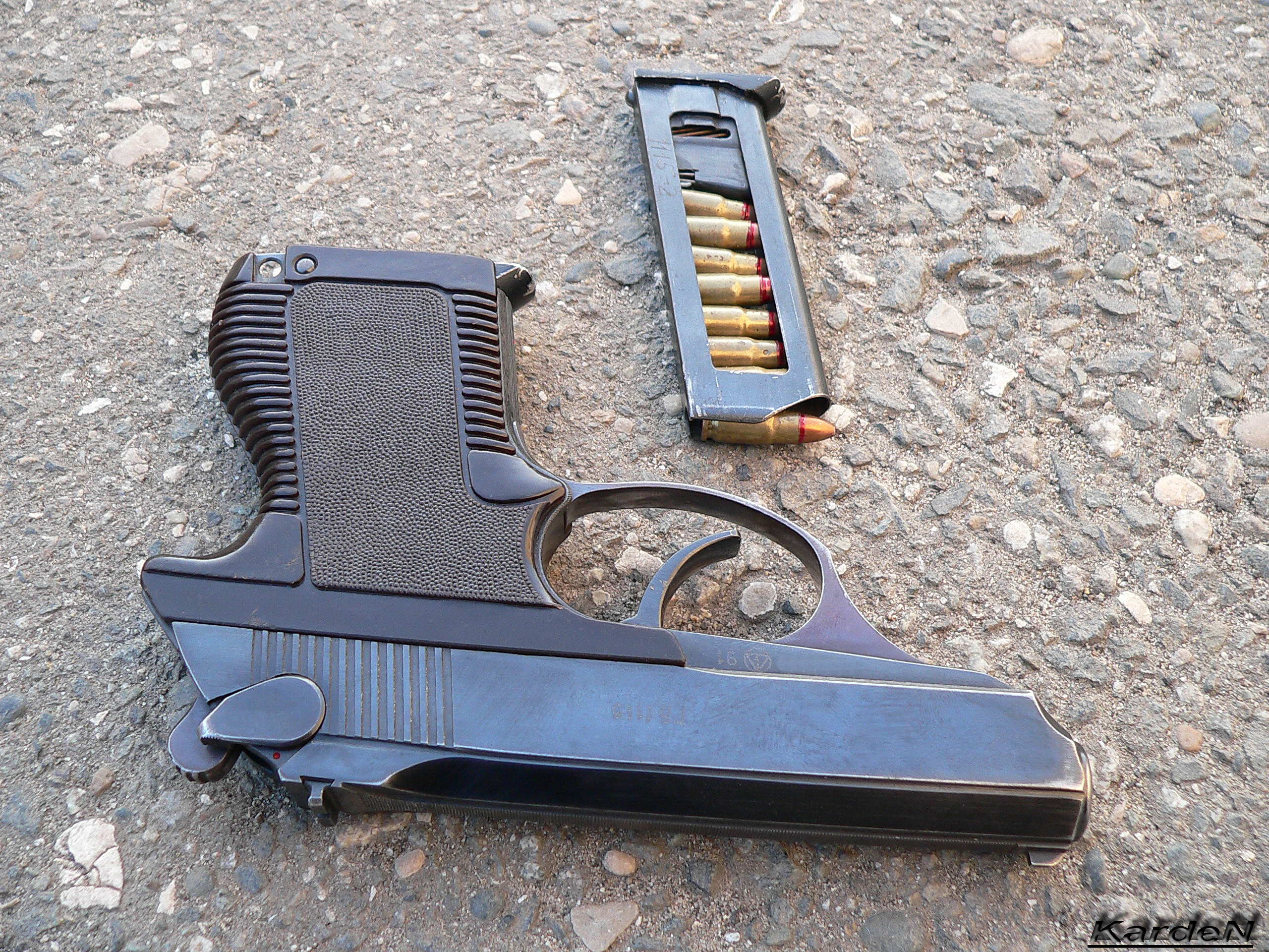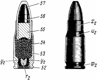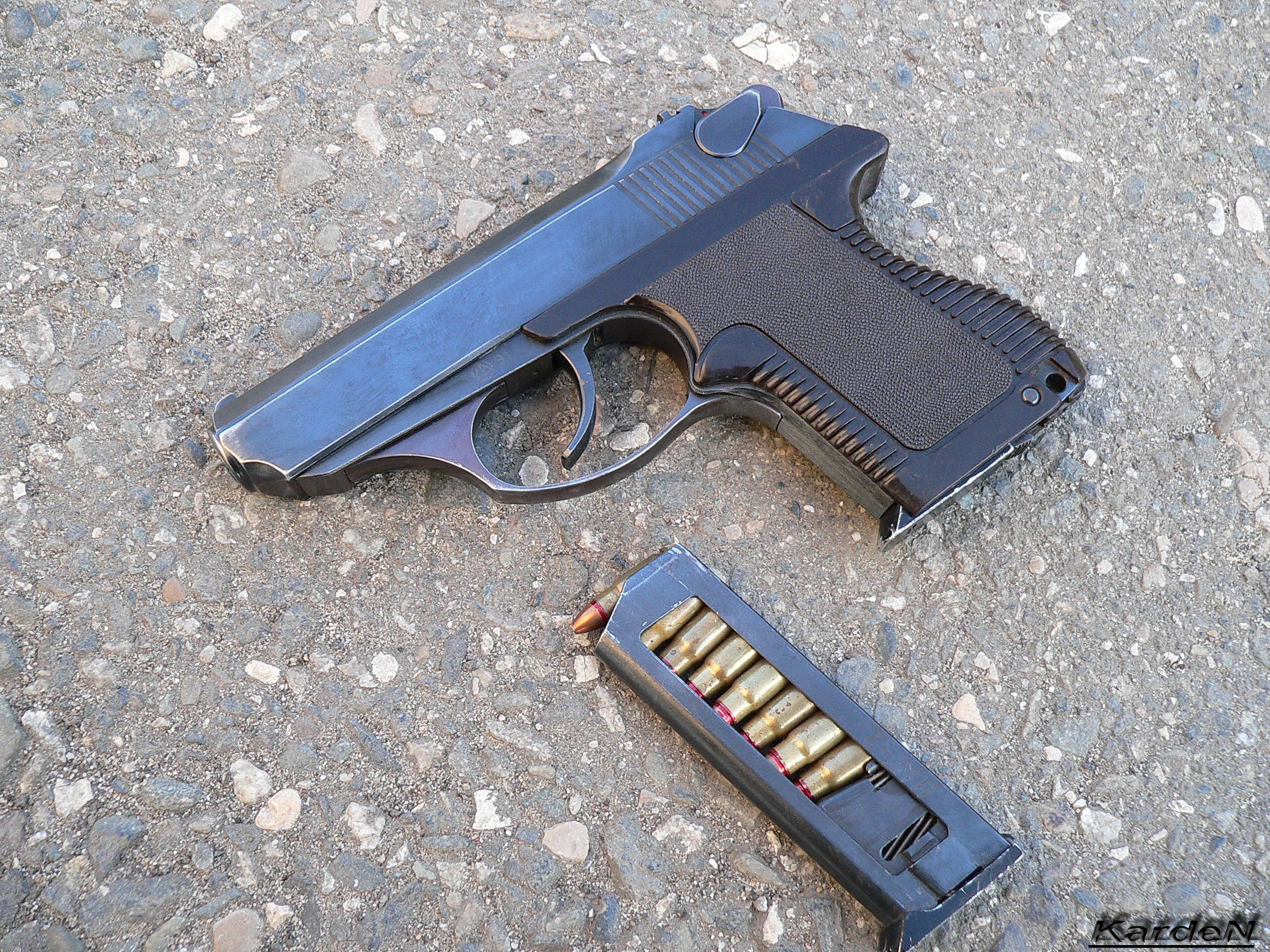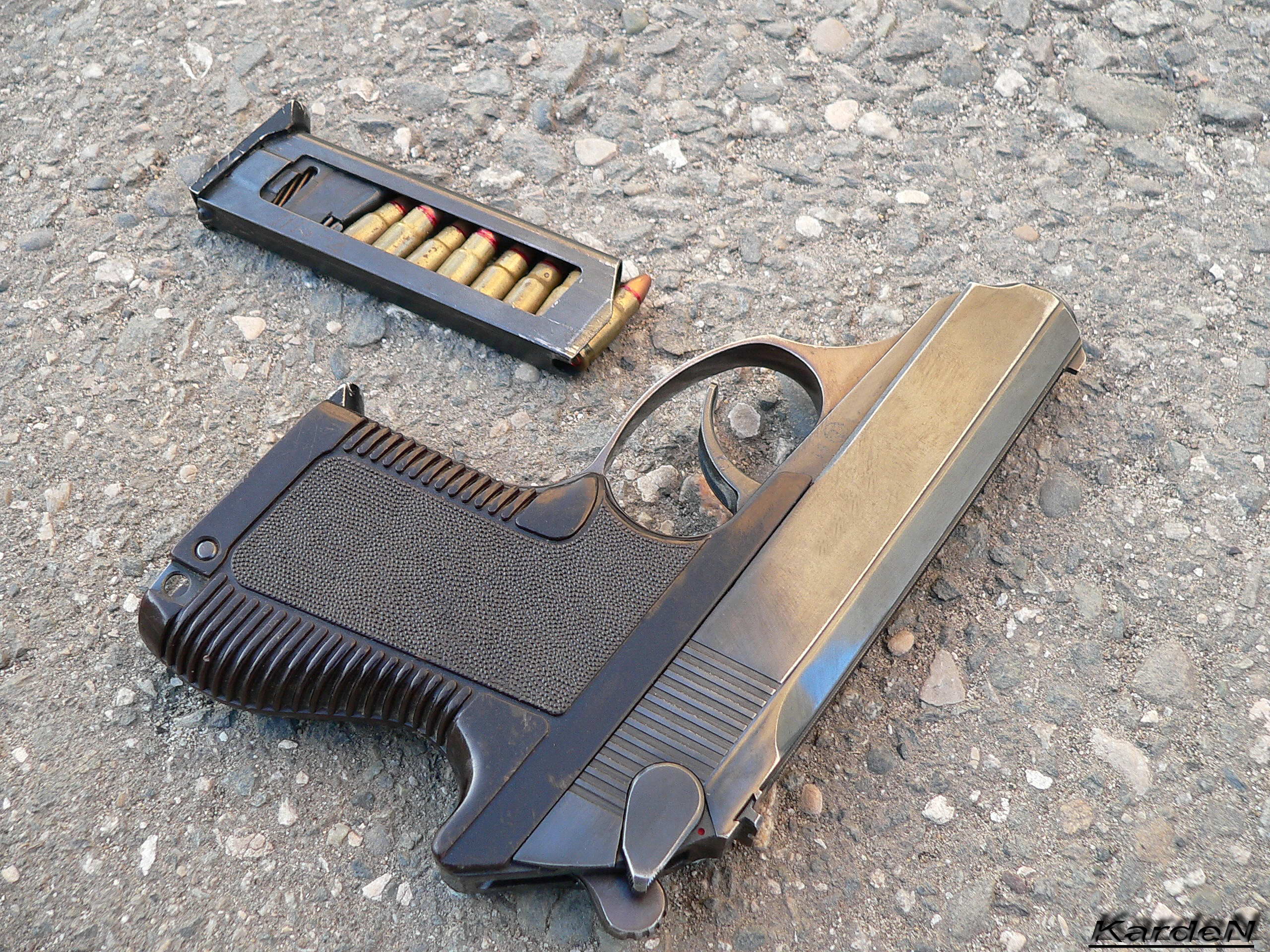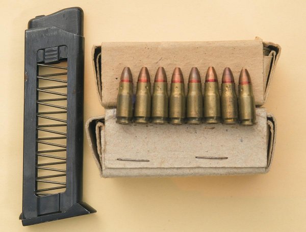 由于现有的枪弹中没有合适的类型可以达到这样的要求,于是中央精密机械工程研究院的设计师在参考了当时在苏联市面上已经有6.35×16mm SR和7.65×17mm SR这两种弹药后,研制了一种新的弹药,称为5.45×18mm MPTs(俄文МПЦ)手枪弹,军方正式定型为7N7(7Н7),这是一种小口径手枪弹,采用瓶颈形弹壳以便能在较短的弹壳内容纳较多的发射药,全弹长24.9mm,全弹重4.8克,弹头重2.55克,发射药量0.17克,弹芯分前后两个部分,前半部为钢制侵彻体,后半部为配重的铅柱。这种小口径手枪弹有比较好的侵彻性能,可在近距离(约5、6米)穿透软质防弹衣。