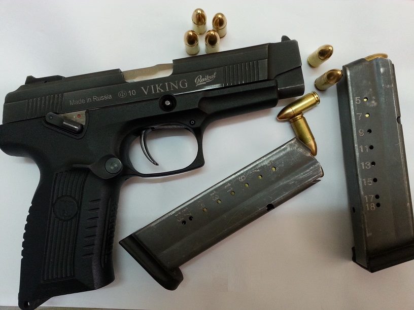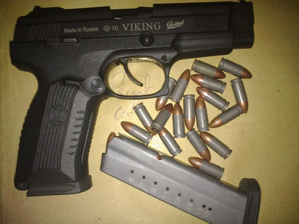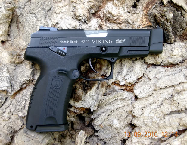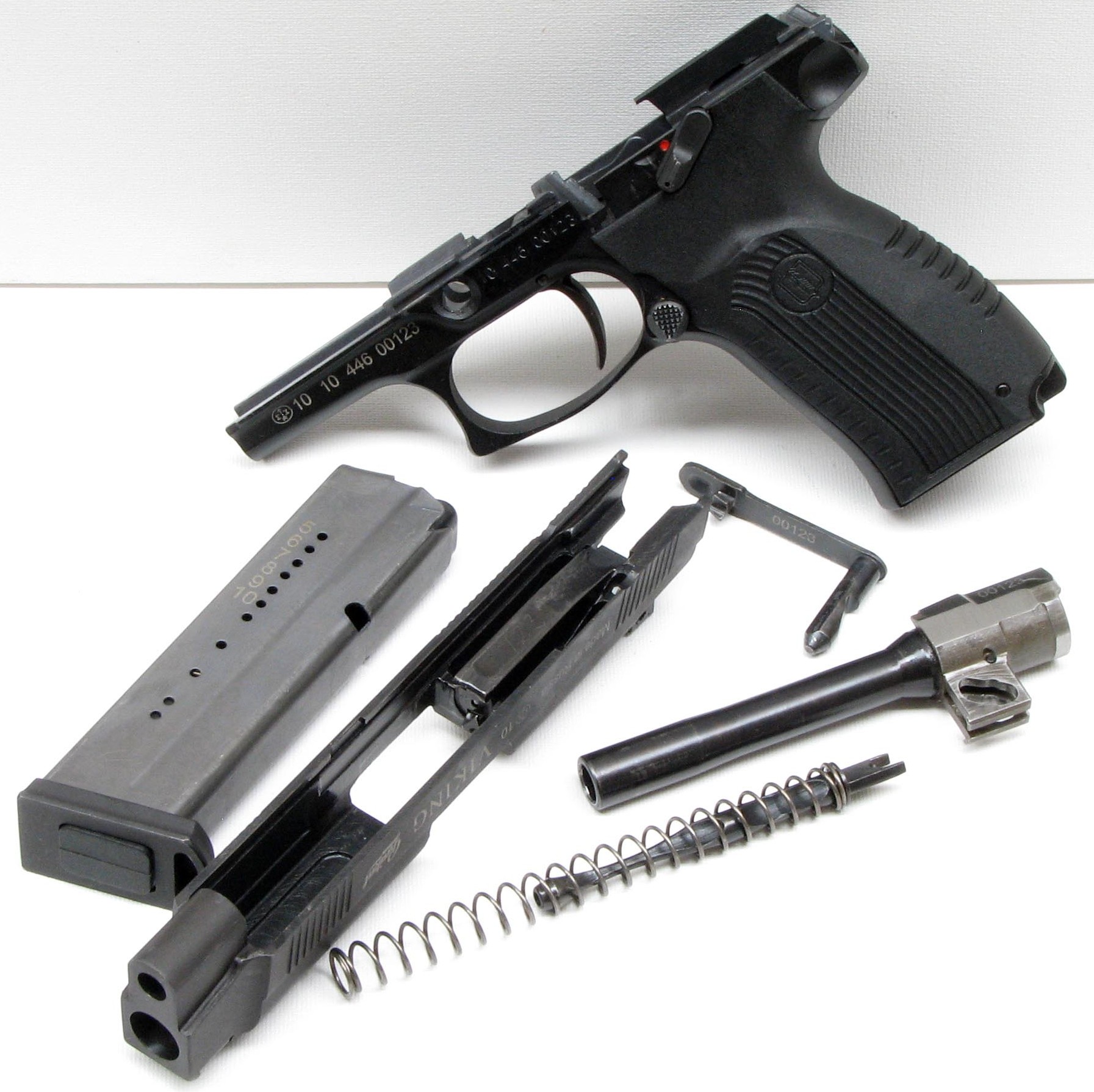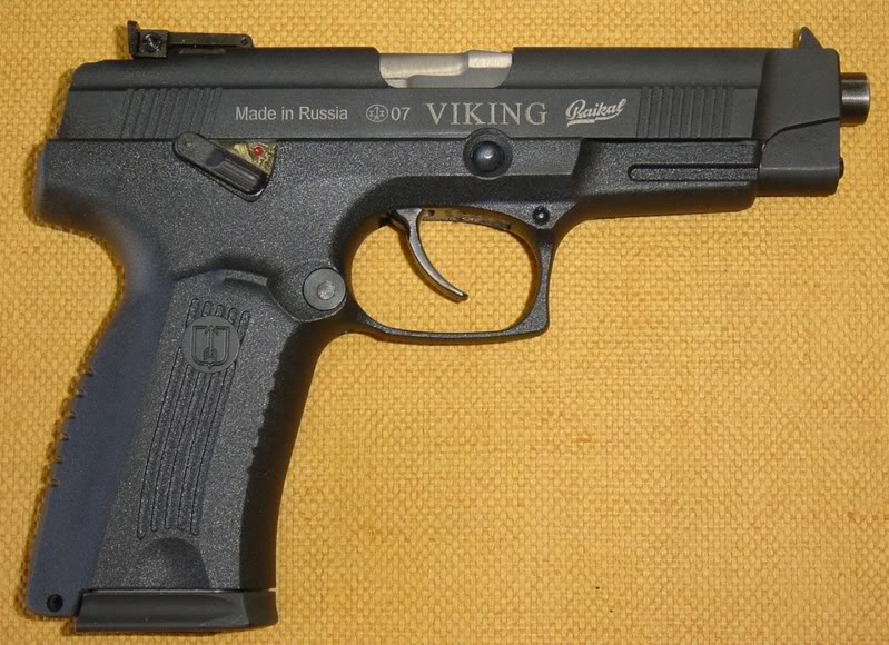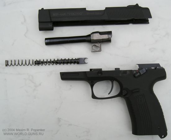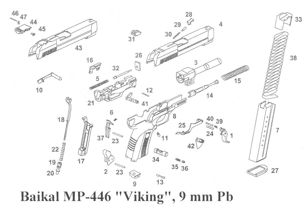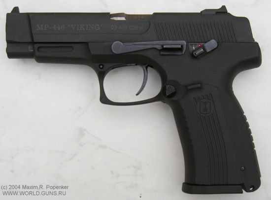 在MP-446“海盗”(俄文Викинг,拉丁化Viking)是伊热夫斯克机械厂在MP-443乌鸦(雅利金PYa)手枪的基础上发展而成的一种运动型手枪,在2003年设计定型。该枪结构原理与雅利金PYa手枪差别不大,主要区别是底把材料和枪管结构:MP-446手枪的底把为内嵌钢架的聚合物,而枪管壁稍薄一些,对膛压的承受能力要低一些,因此不能发射军用的强装弹(7N21或7N31等),而只能发射普通的9×19mm卢格手枪弹(派拉贝鲁姆口径)。