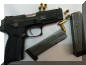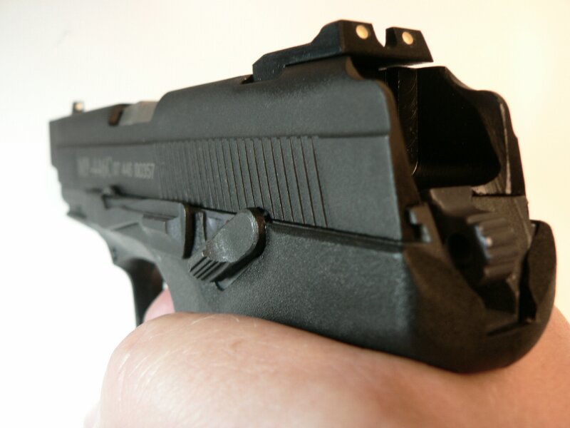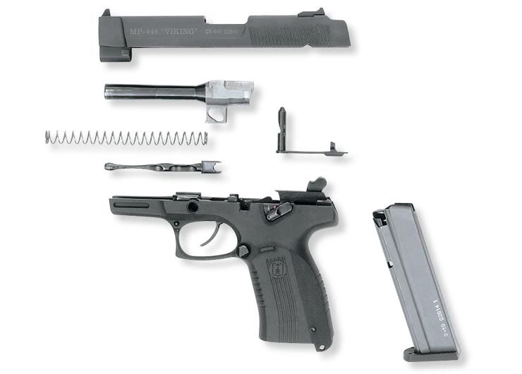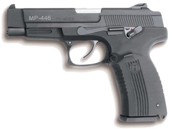 除了不能发射强装弹外,MP-446的性能并不比MP-443要差,而且由于全塑料底把,枪还要轻一些舒适一些,而且在底把前端防尘盖上还整合了附件安装槽,因此安装附件要容易得多。另外MP-446有两种容量的弹匣,纯粹用于民用市场的弹匣的容量只有10发,而向军/警用户提供的弹匣则是MP-443的18发弹匣(原型枪是与早期的MP-443一样是17发)。