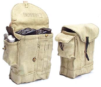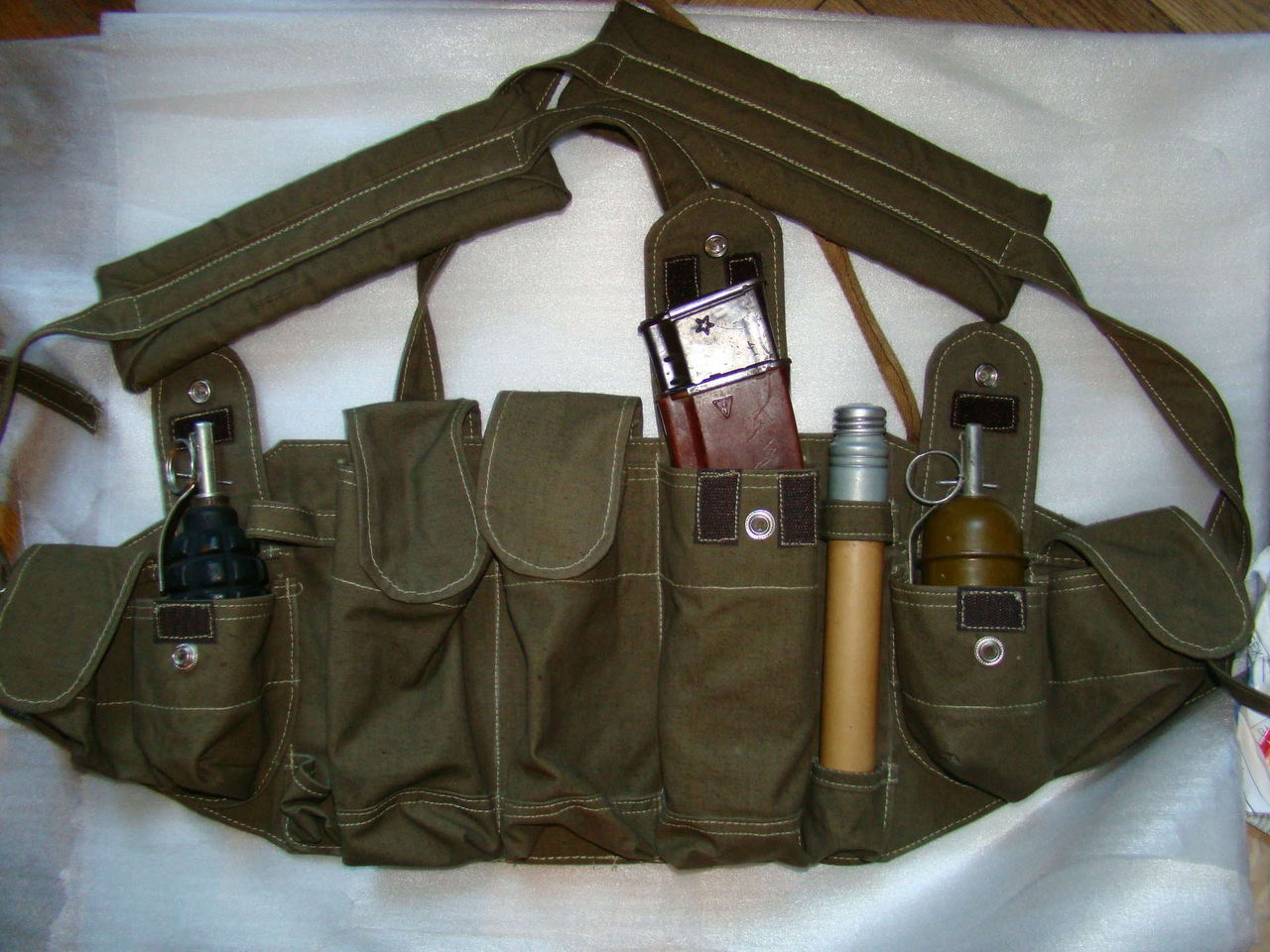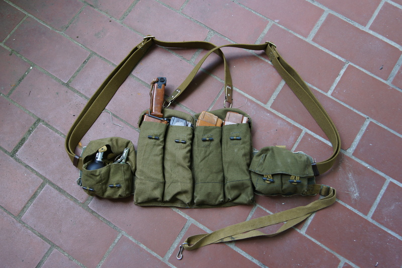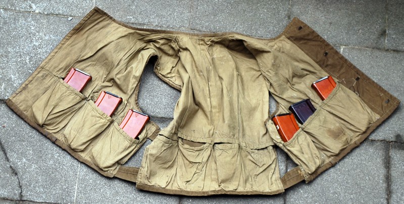 除了上述的RD-54的DIY胸挂袋外,还有些苏军士兵也用同样的做法,把两个标准的弹匣挎包车缝在一起制作成一个胸挂袋。