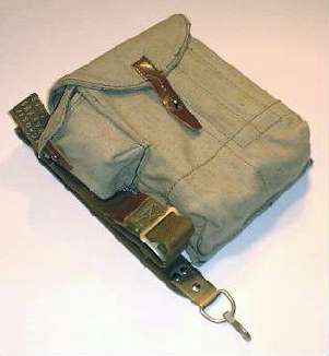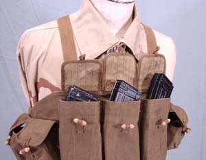 标准的苏联/俄罗斯4袋型弹匣挎包,图中的弹匣袋是1990年代的产品,不过几十年来,从AK-47到AK-74,这种弹匣袋的造形结构几乎都没什么变化。早期的苏联AK弹匣挎包可放3个弹匣及一些桥夹之类的杂物,侧面还有一个小口袋用于放枪油瓶。后期的弹匣挎包改为放4个弹匣,其他国家生产的也多数是这种类型。