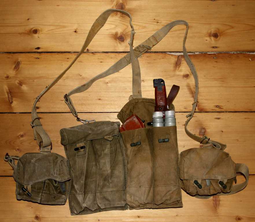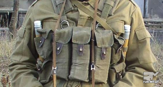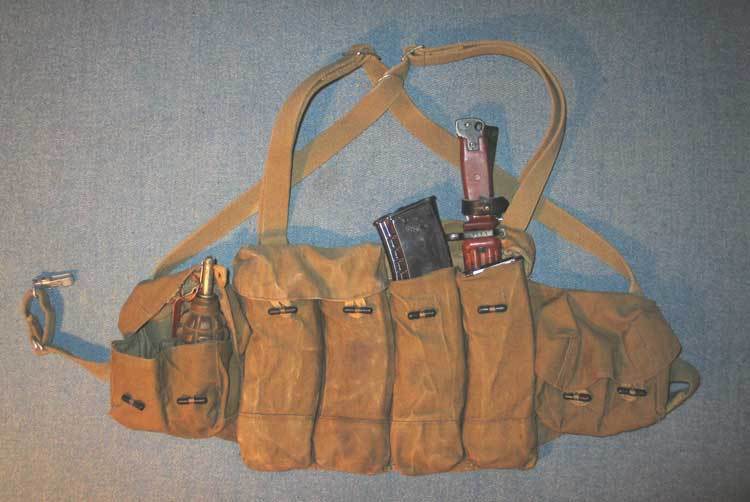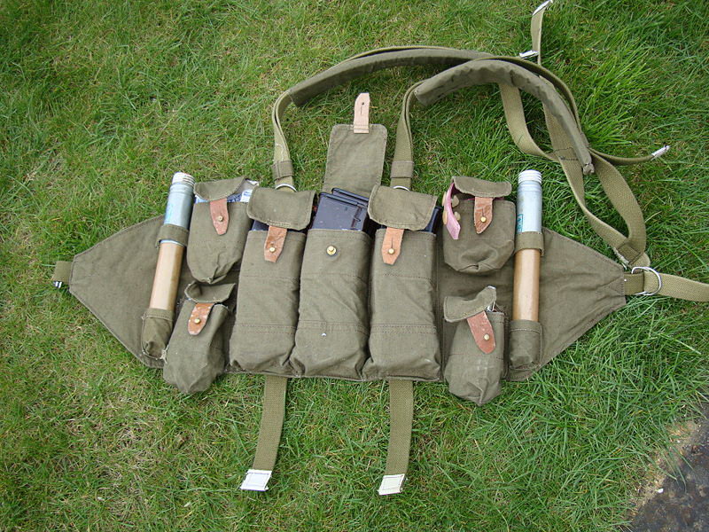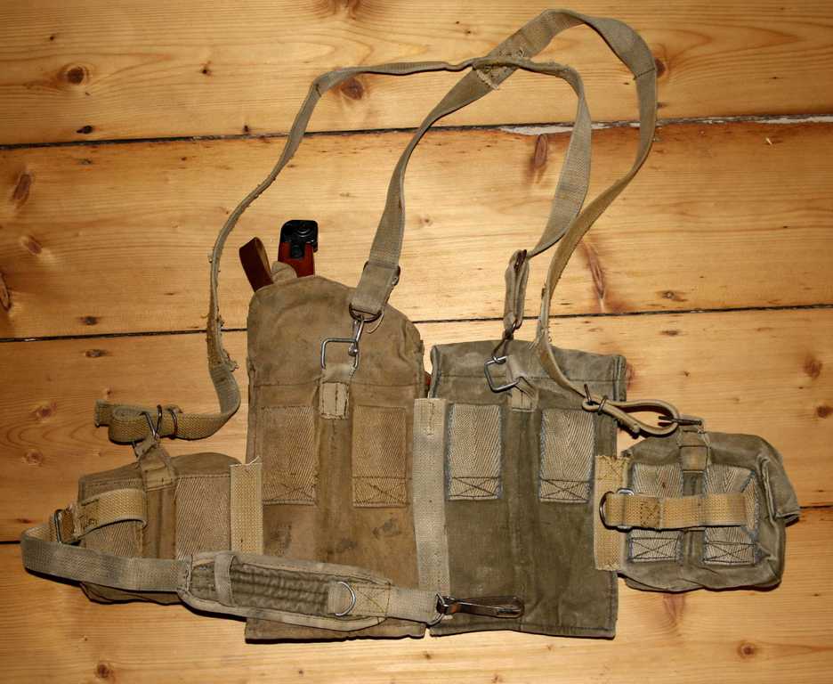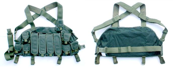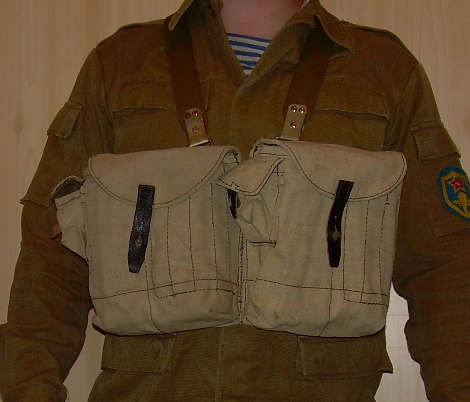 这种胸挂袋有3个主袋,可以放3个弹匣,左右两边各有2个小袋用于枪油、急救包、少量的零星子弹(如曳光弹)等杂物,有些苏军士兵用来装卵形手榴弹。由于每一个弹匣包里只能装1个弹匣,有些苏军士兵浸水来泡松泡软布料,硬塞进2个AK-74弹匣。