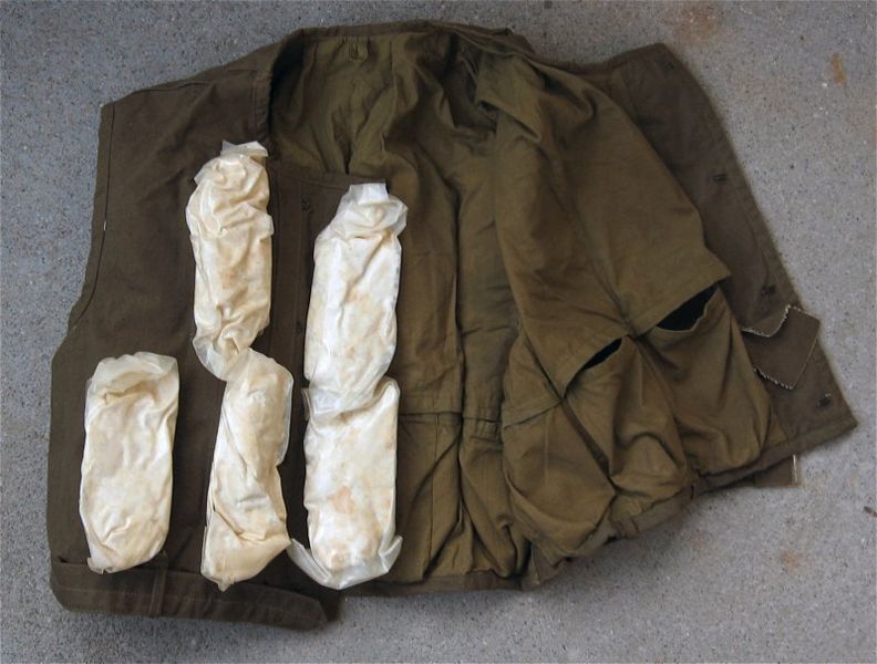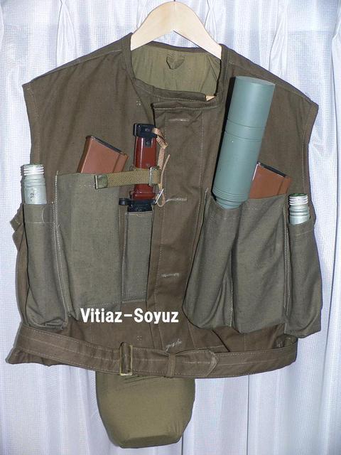 在阿富汗的苏军还有更奇特的DIY携具,就是以下这种特殊的弹匣背心。其实这原本是救生衣,不过在阿富汗是用不上的,所以就有士兵把内侧的浮力填充物取出来,正好可以装上几个弹匣。不过弹匣放在背心内侧一来是不会舒服,二来在战斗中取用也麻烦,只有懒人才这么干,所以有些不那么懒的人,就会车缝一些弹匣包在救生衣的外面。(以上感谢贴吧网友@都将哦哦我觉得的提醒)
