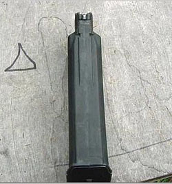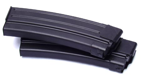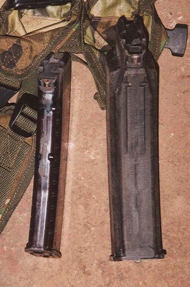 左侧为透明塑料弹匣,右侧为AG-4S塑料制弹匣,两种弹匣的底部都有伊热夫斯克厂的三角形标记。
