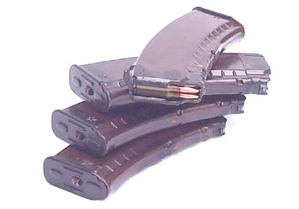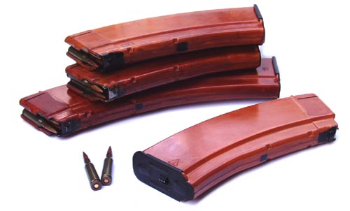 苏联从AK-74开始就采用塑料弹匣,优点是成本低、生产效率高,而且重量轻。最初的AK-74弹匣为亮橙色外表,后来改为深棕色,另外也有一些采用透明材料的,但极少应用。为RPK-74而研制的45发容量弹匣与AK-74的30发容量弹匣是完全通用的。