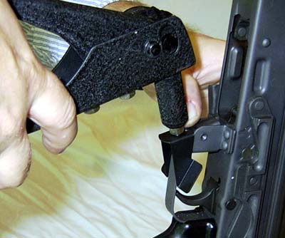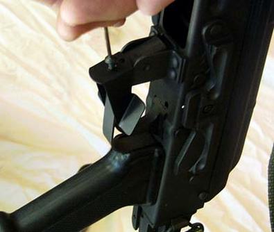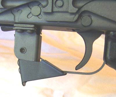 原本我以为是让扣扳机的手指直接释放弹匣的改装,后来才发现,原来这是让弹匣不容易更换的小部件。因为在某些地区的枪支管制法规中禁止扣拆卸弹匣,只能使用固定弹仓,所以有些想玩AK的人就用这种方式去符合法律。