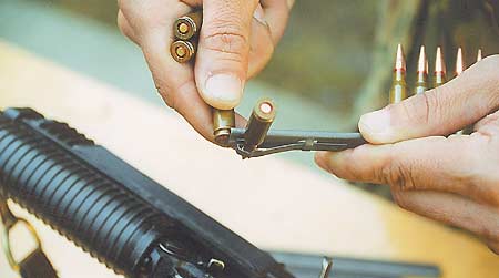 装填联结器,使用方法是把联结器装在弹匣口,然后把弹夹插在联结器上,直接把子弹压进弹匣,这样三个弹夹就可以装满一个弹匣。