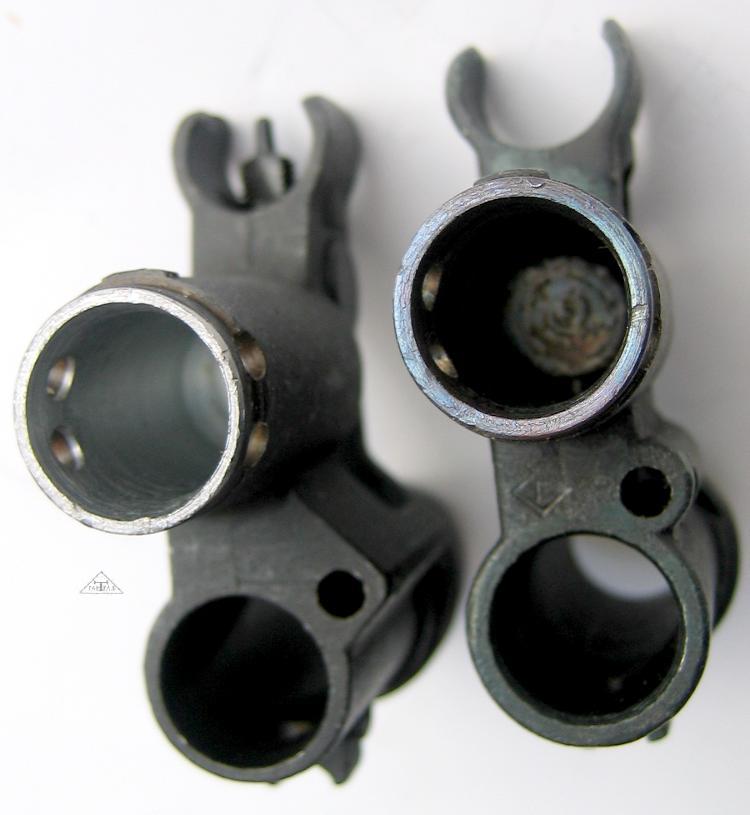 上护木的固定座及背带环,左边是AK-105,右边是AK-104
