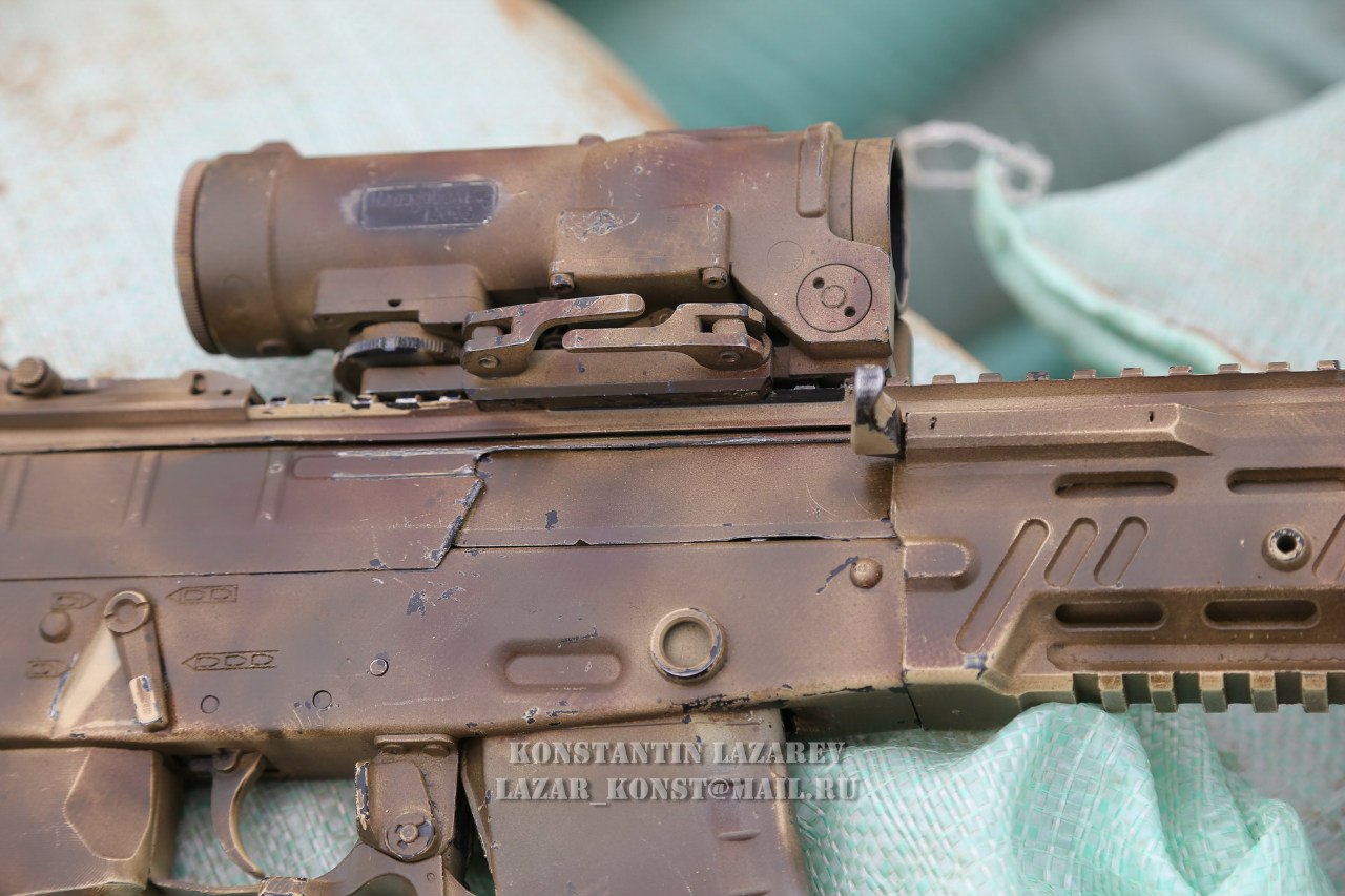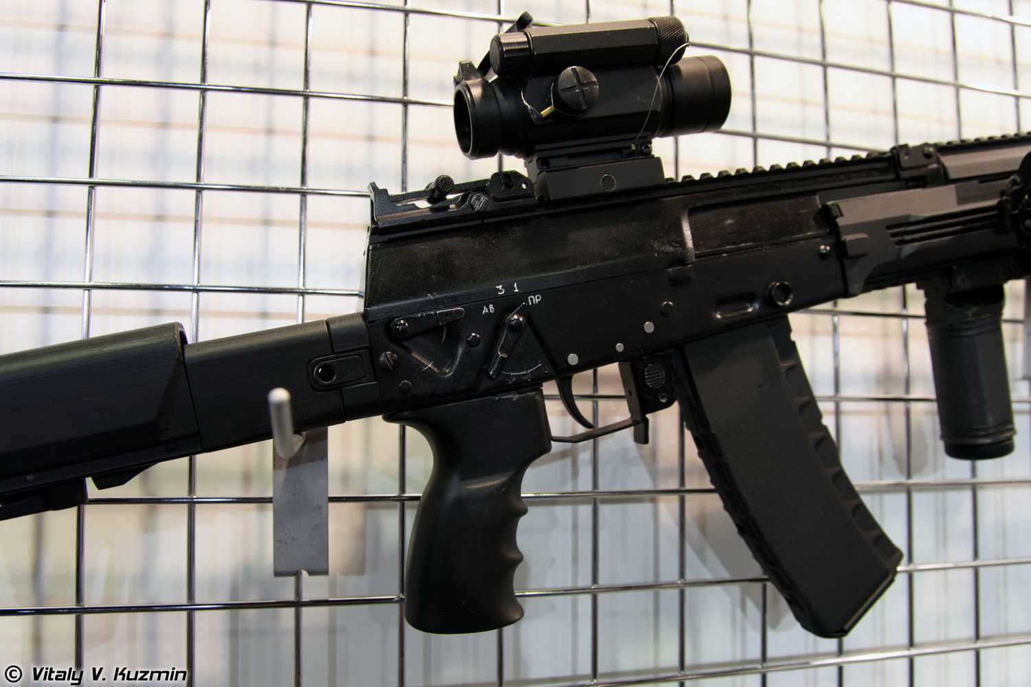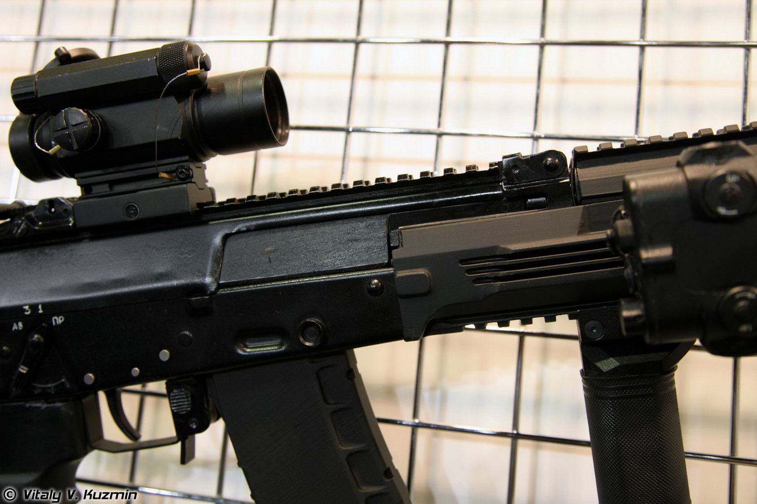 在机匣盖顶部至护木顶部整合有皮卡汀尼导轨用于安装光学瞄准具,护木的左、右侧和下方也有导轨,导气箍上还有一小段导轨。显然是因为现在俄军中使用皮卡汀尼导轨改装枪支的情况已经令伊孜玛什公司不能无视这样的需求。另外机械瞄具的照门改为觇孔式,而不是AK系列传统的缺口式,所以照门从旧AK的机匣前端移至机匣尾部(觇孔的明视距离短),而且直接就安装在机匣盖上。
