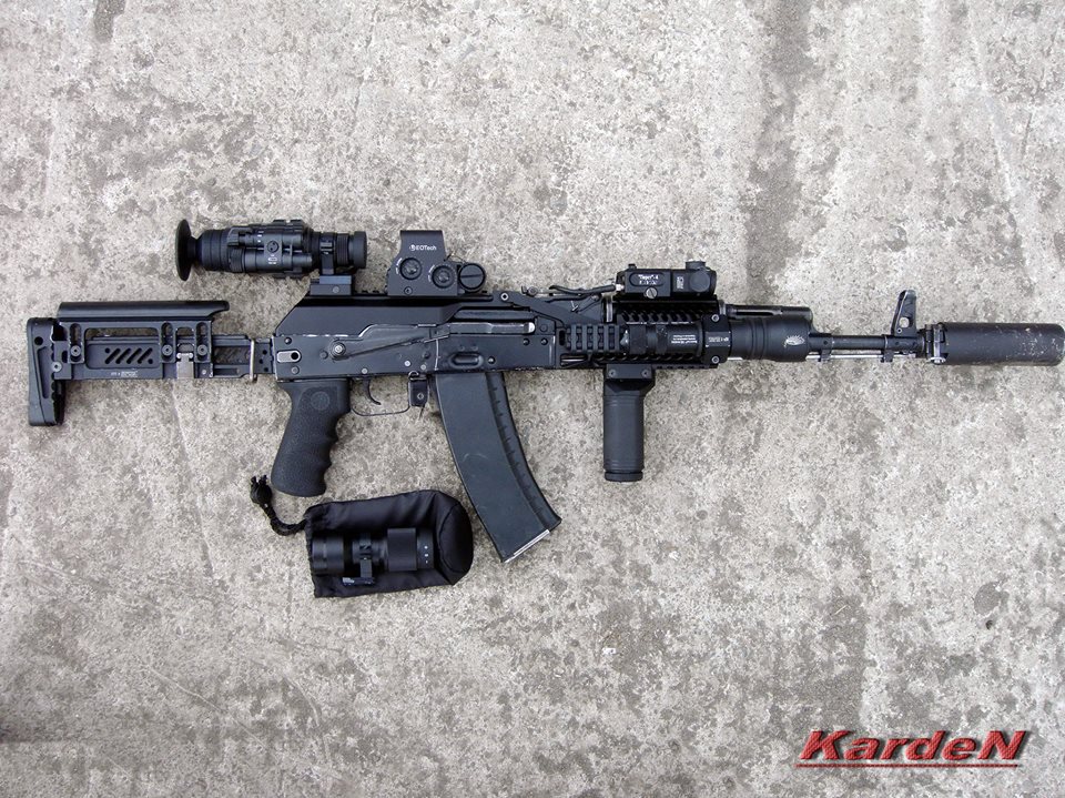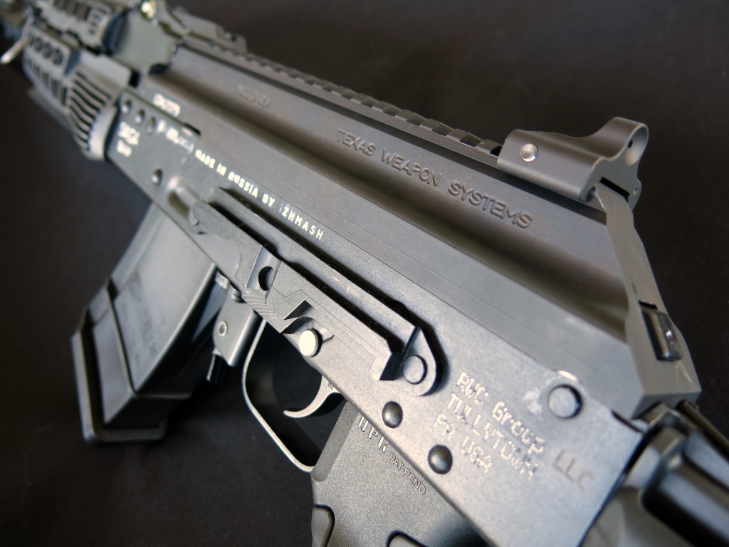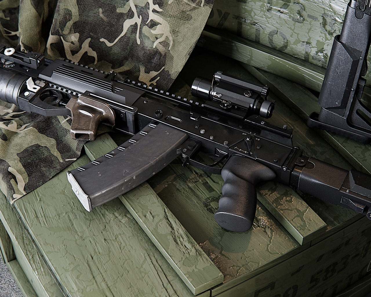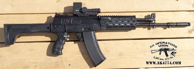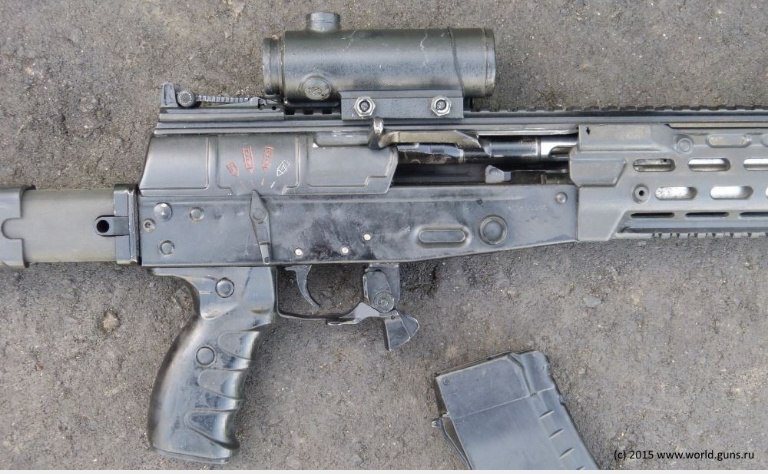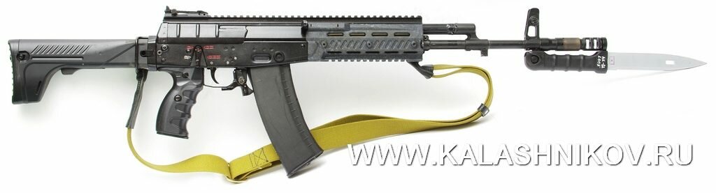 在机匣盖顶部至护木顶部整合有皮卡汀尼导轨用于安装光学瞄准具,护木的左、右侧和下方也有导轨,导气箍上还有一小段导轨。显然是因为现在俄军中使用皮卡汀尼导轨改装枪支的情况已经令伊孜玛什公司不能无视这样的需求。另外机械瞄具的照门改为觇孔式,而不是AK系列传统的缺口式,所以照门从旧AK的机匣前端移至机匣尾部(觇孔的明视距离短),而且直接就安装在机匣盖上。