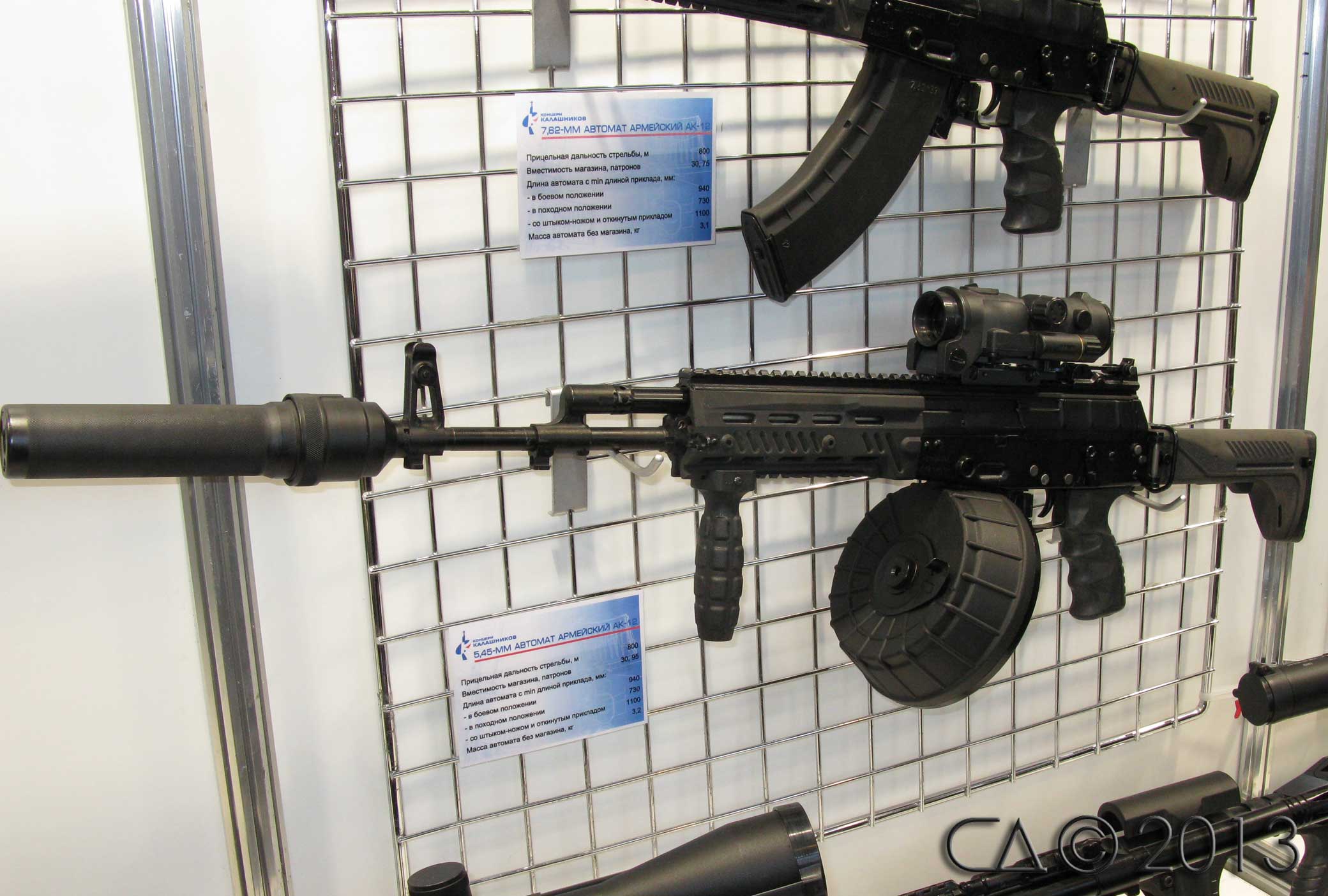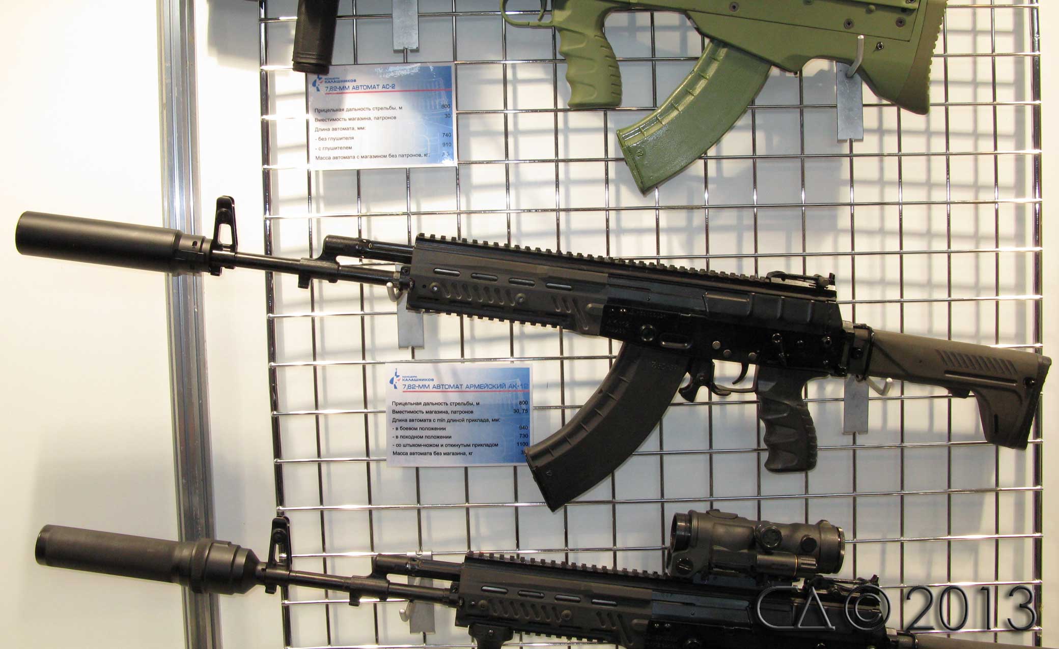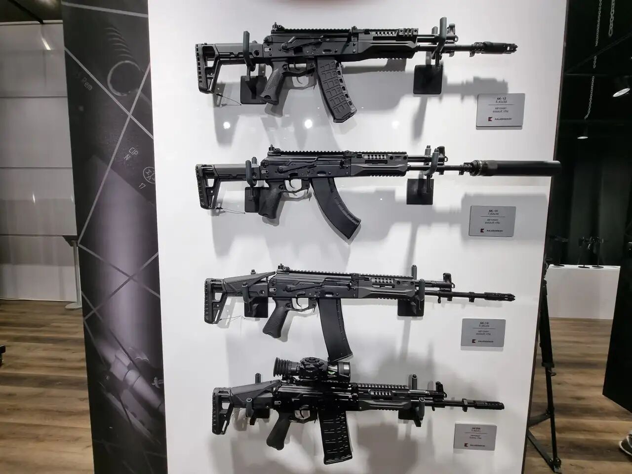 2013年俄罗斯军警装备展上展出的5.45和7.62口径的AK12的步枪型和卡宾型,此时的样枪已经把顶部各自独立的两段导轨整合成一整段,拉机柄槽被防尘盖所遮挡
