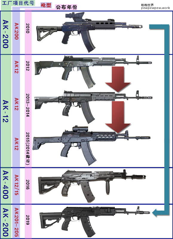 2010年,伊孜玛什公司推出了名为AK-200的项目,希望能取代俄军现装备的AK-74M和AK-100系列(主要为AK-103、AK-104和AK-105);2012年,该公司又推出了名为AK-12的样枪,从这两种枪的设计上分析,并不是同一种型号。但由于2013年至2014年间的一些宣传资料中提到AK-12的研发是始于2010年,而且自AK-12推出后,伊孜玛什公司也基本没再提及AK-200,在许多资料里也把两者相提并论,因此在当时我曾以为AK-200和AK-12是同一个项目,前者是项目名称,后者是具体型号名称。尤其是2016年有消息指出卡拉什尼科夫集团有一个厂内代号叫“AK-400”的项目,而AK-12和AK-15都是AK-400项目中的枪型时,我更是一度怀疑伊孜玛什公司在2010年是临时用AK-100更换部件临时改装了个样枪出来,并用AK-200名称来立项,展示出来向俄罗斯国防部争取支持及经费。