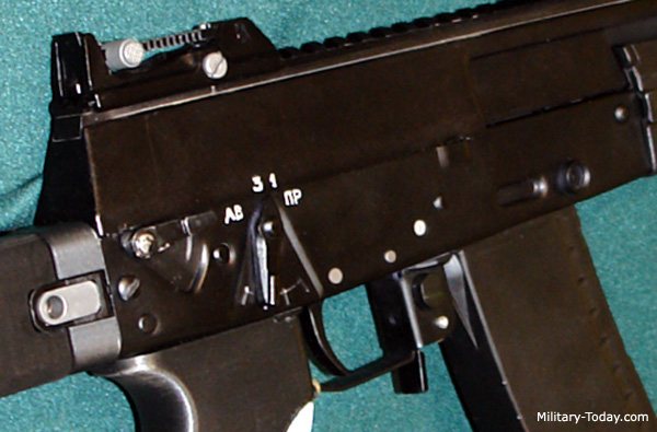 ![]() ![]() ![]() 2014年底样枪上的快慢机,从左到右分别为保险位置、点射限制位置和连发位置 |