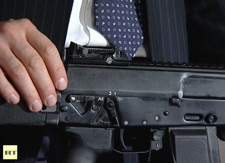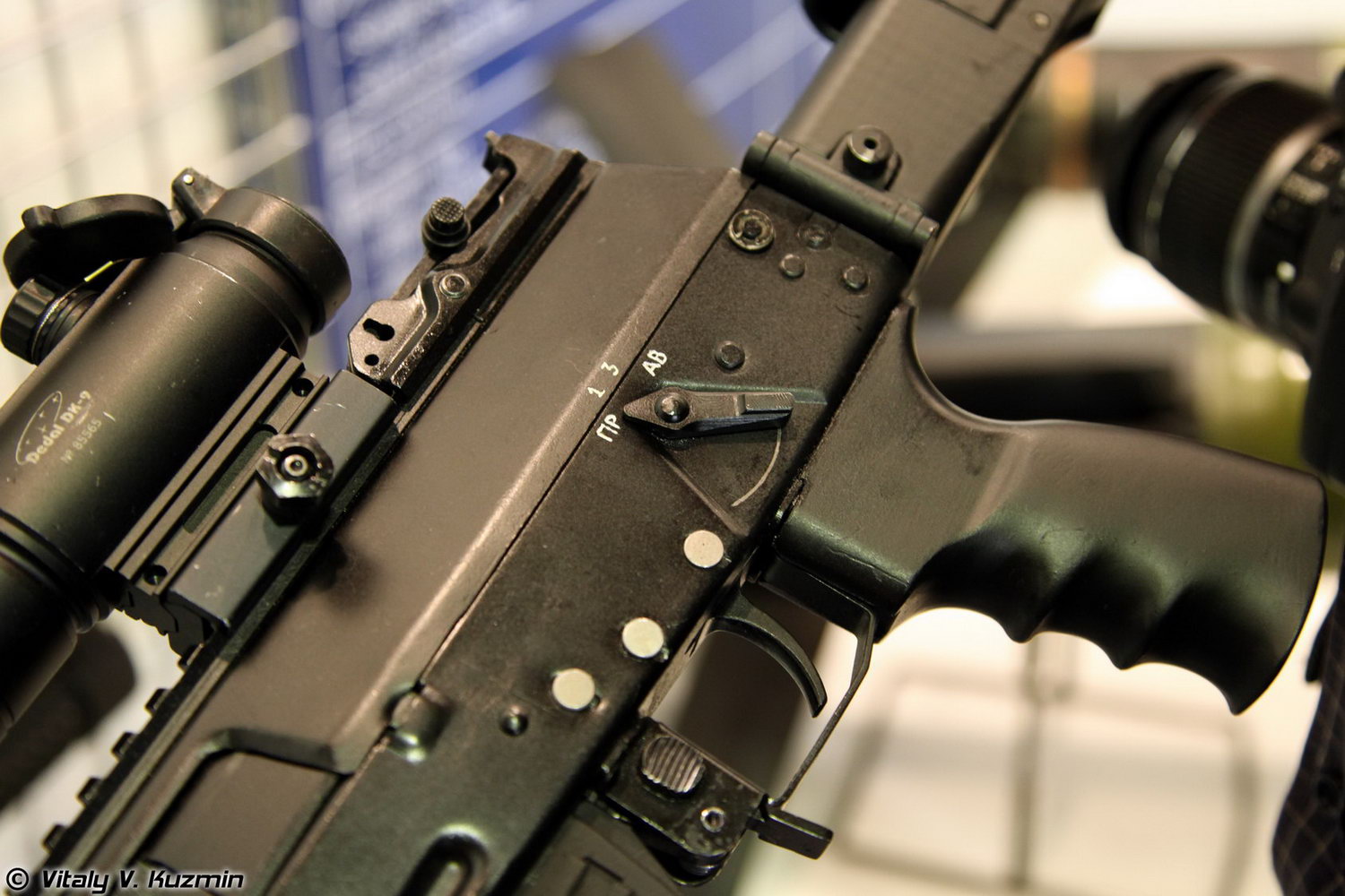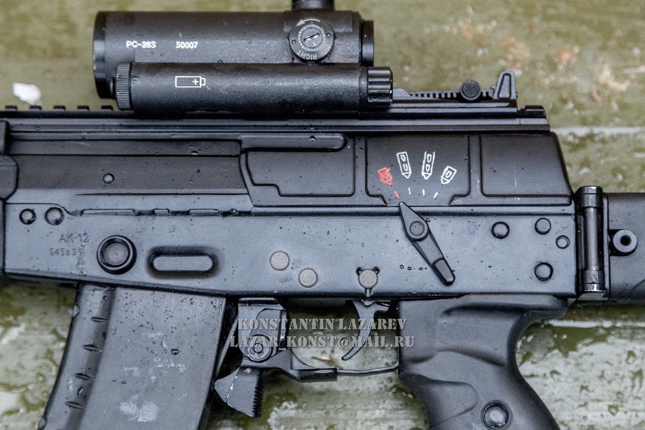 和以前的AK步枪不同,2012~2014版的AK-12样枪的快慢机不再具有拉机柄槽防尘盖的功能,快慢机的形状和位置都和以前的AK不同,而且左右两侧都有,因此无论用左手还是右手射击都能以拇指轻松操作快慢机(所以在宣传资料中称之为“方便了单手操作”,而非国内一些网站编辑们错误理解的那样是“专门用于单手射击”)。另外AK-12的快慢机有4个位置:保险、半自动、三发点射、全自动。在2012年的时候,根据俄罗斯方面公布的资料(当时的维基百科也是引用这些资料),AK-12的理论射速有两档,全自动射击时是每分钟600发,而3发点射时则达到每分钟1,000发。但到了2014年公布的资料中,只提及AK-12的理论射速为600~700发/分。结合在2018年看到的资料里提到,在对AK-107/AK-109进行厂内试验时发现高射速短点射的射击散布面比传统结构的AK步枪要小,我推测是出身自TsKIB SOO的前任首席设计师弗拉基米尔·兹洛宾一开始就给AK-12设计了高射速的短点射机构,然而在2013年的试验中失败后(基本可认定是可靠性问题),重新简化了发射机构的设计,因此到了2014年的样枪上,就取消了高射速的3发点射功能,而且通过图片中快慢机标记来判断,2014版的AK-12还把3发点射限制改为2发点射限制。
